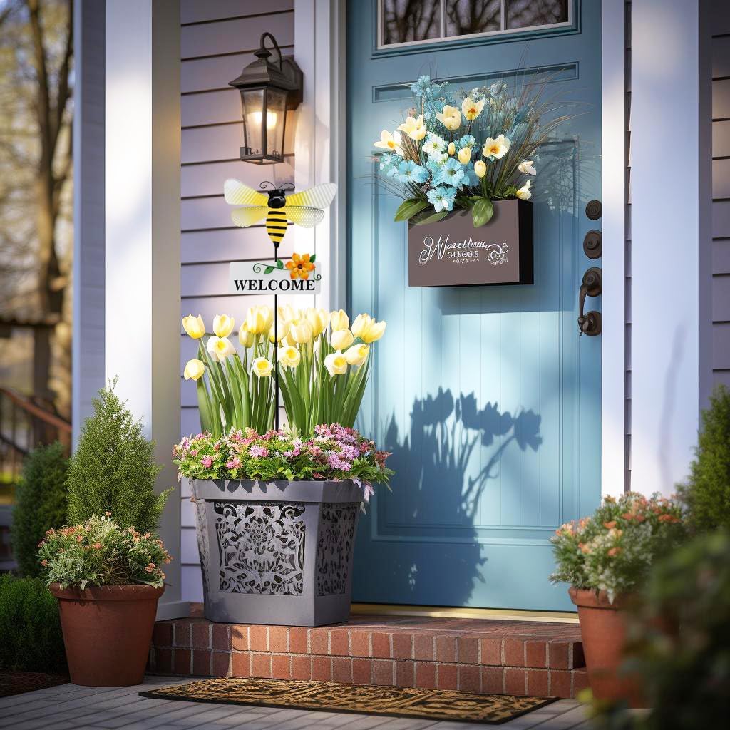 • DETAILED GARDEN DECOR: Metal butterfly garden stake is hand painted with vivid colors and decorated with flower and welcome sign. The garden stake decor will definitely be an eye catching garden decor. The garden decor insect is connected to the stems by springs, when the breeze blows, it will nod or shake head and look lifelike.