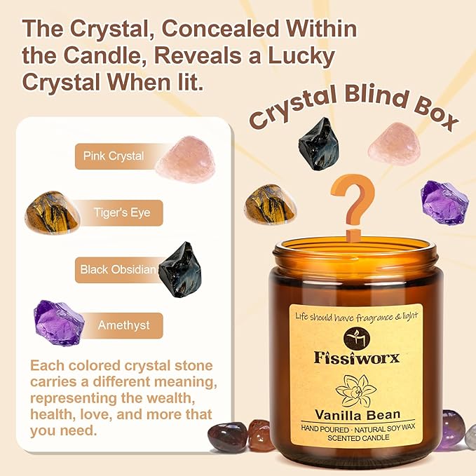 • 🌳Natural Soy Wax With Lucky Stone - Enjoy up to 60 hours of continuous burn time , proudly made with 100% natural soy wax that burns evenly. Our fragrances are paraben-free, phthalate-free, and never tested on animals. Fissiworx scents gently enhance spaces rather than overpower them, ideal for those sensitive to scents.(Our soy wax candles contain a random lucky stone that can bring good fortune to everyone. Additionally, it will not burn nor pose any danger).