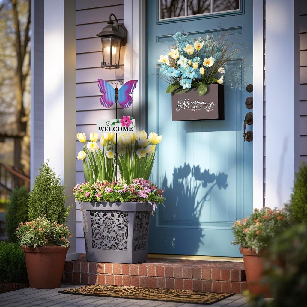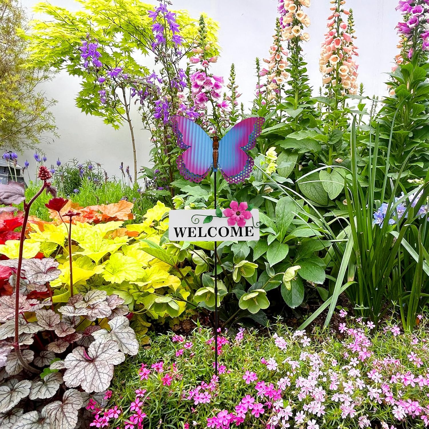 • DETAILED GARDEN DECOR: Metal butterfly garden stake is hand painted with vivid colors and decorated with flower and welcome sign. The garden stake decor will definitely be an eye catching garden decor. The garden decor insect is connected to the stems by springs, when the breeze blows, it will nod or shake head and look lifelike.