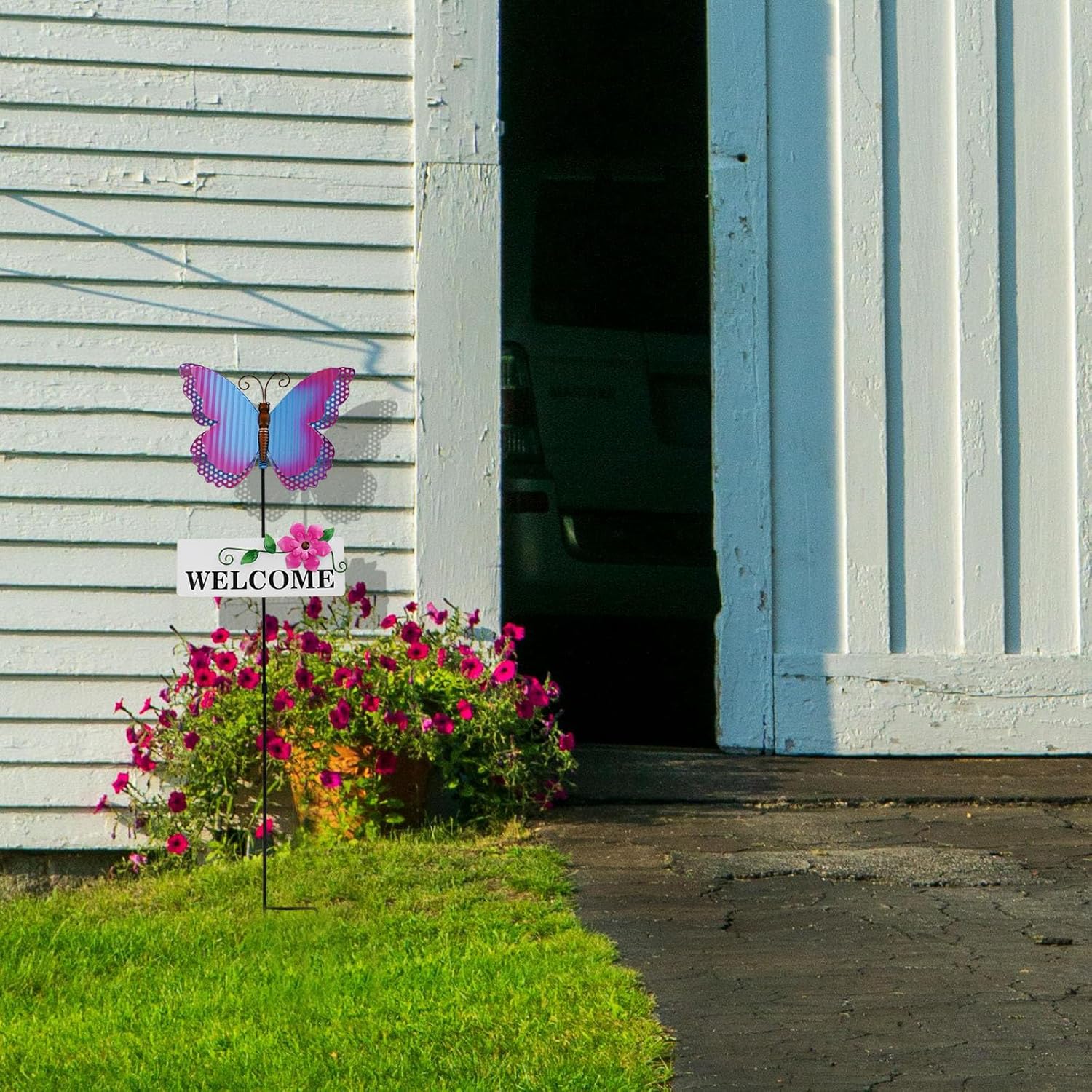 • EASY INSTALL: Decorative garden stake comes in 3 parts, which are pretty easy to assemble. Just screw the butterfly and stem together by hand,then insert the welcome sign, no tools needed. Butterfly metal yard art stake will bring more refreshing feel of nature for your pathway,walkway, planter etc.