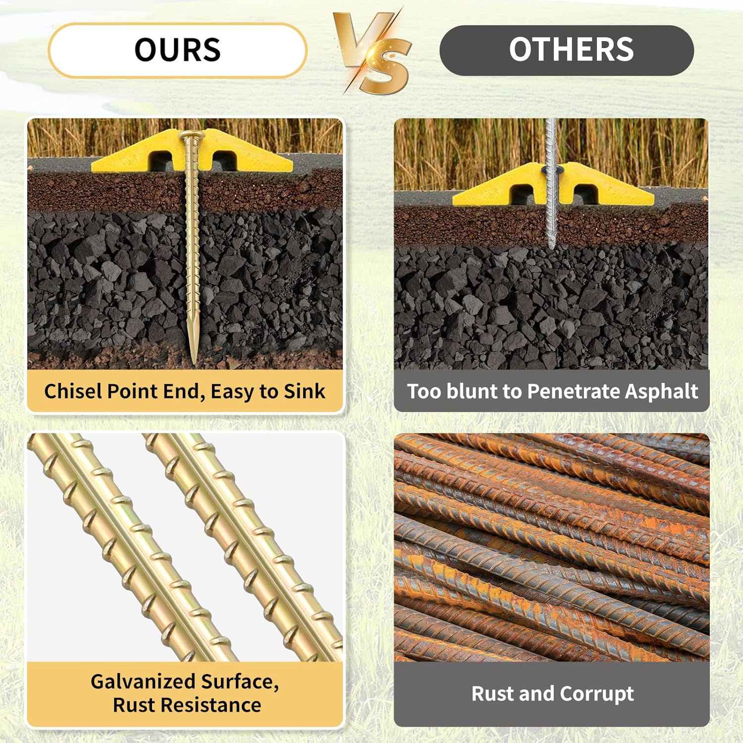 • 【Ribbed & Yellow Galvanized】These rebar stakes are made of malleable steel material. Yellow galvanized to help avoid rust. Ribbed ground anchors are solid, secure firmly and no bend.