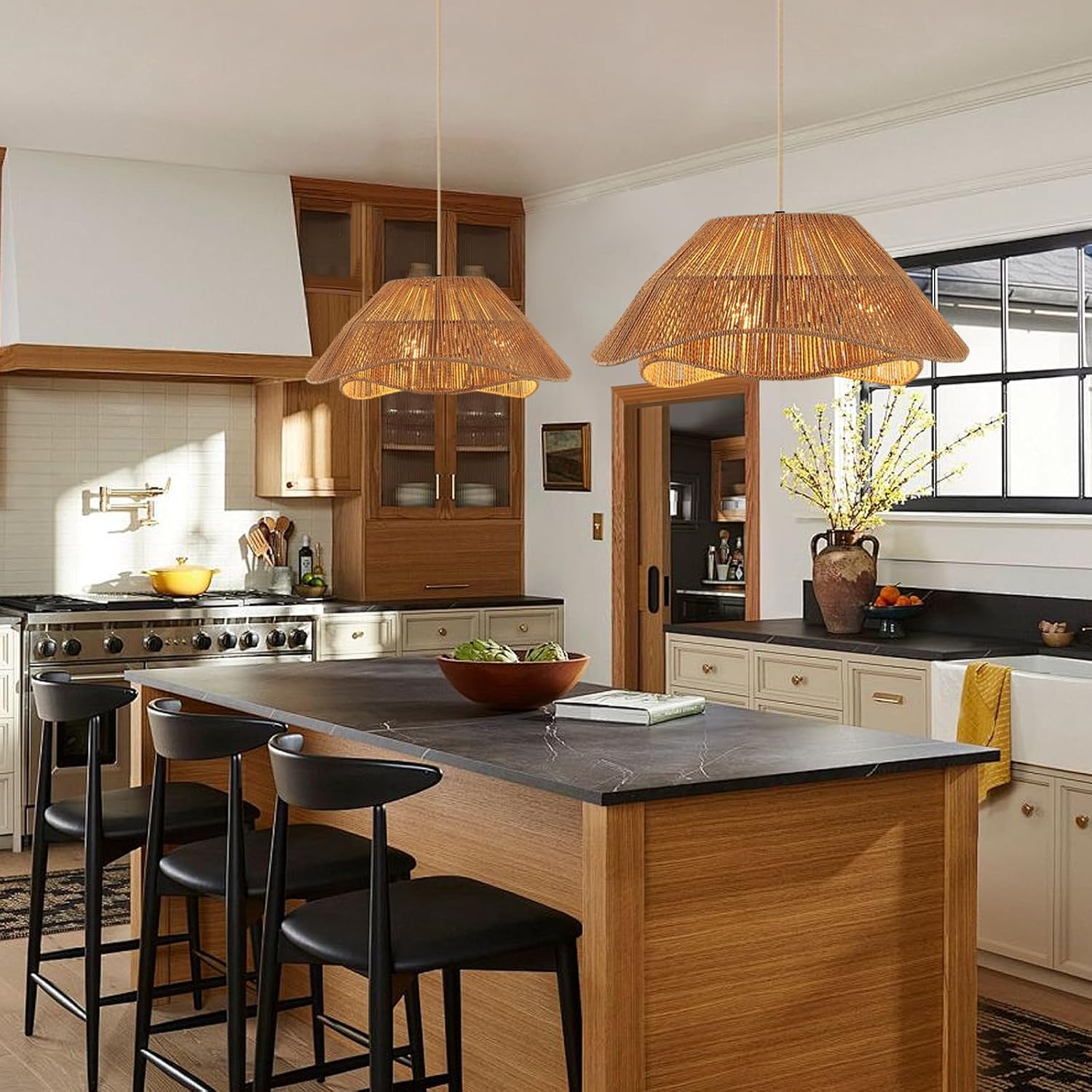 • 【Unique 2-layer Rattan Design】The boho pendant lights kitchen island is made of the hand woven natural rattan and durable metal to be a bohemian look. The double irregular design casting petal-shaped shadows on the ceiling, adding a warm and inviting atmosphere.