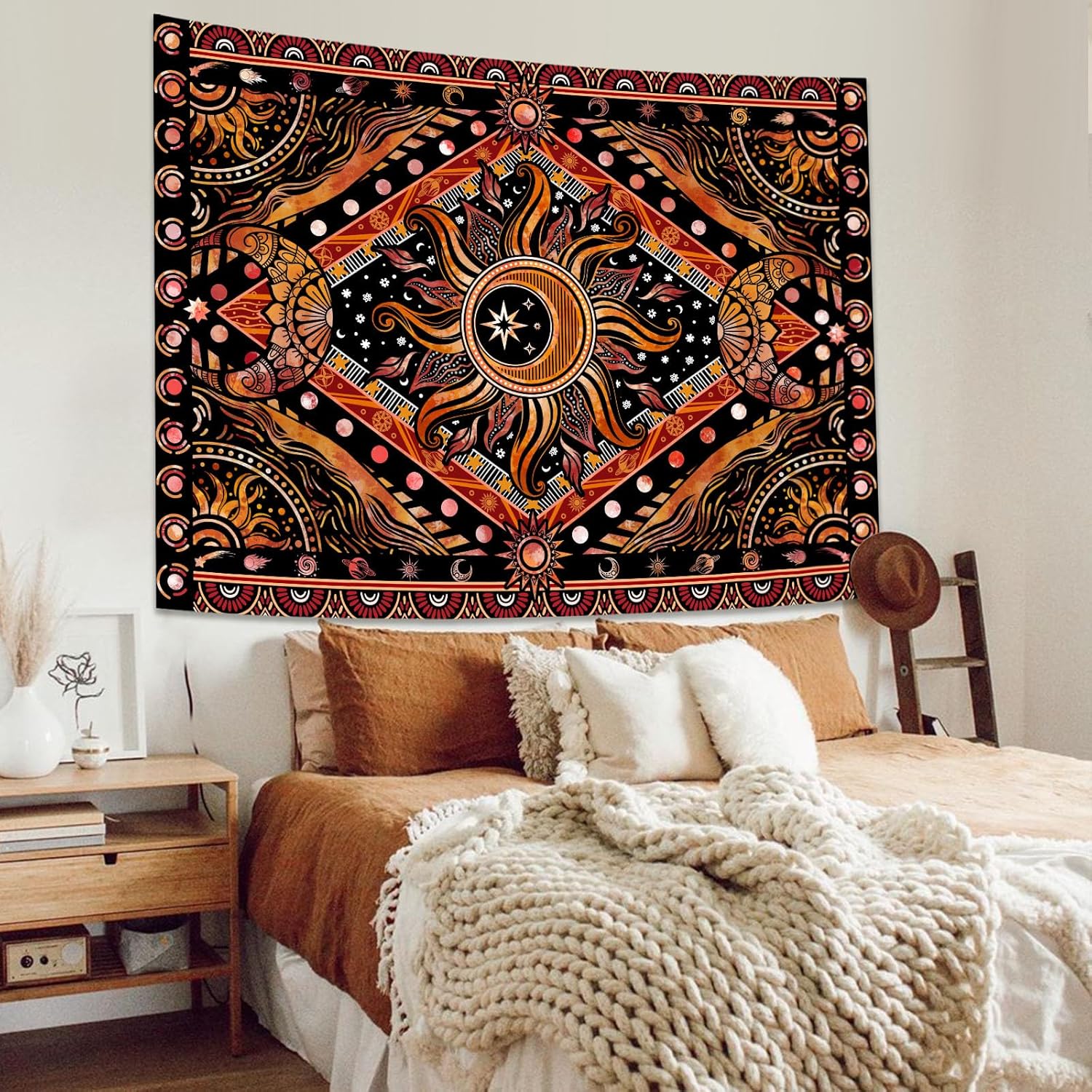 • Hippie Sun and Moon Design: This tapestry features an intricate, bohemian-inspired sun and moon design with warm, earthy tones. It captures a sense of celestial harmony and peace, adding a unique, spiritual element to any space.