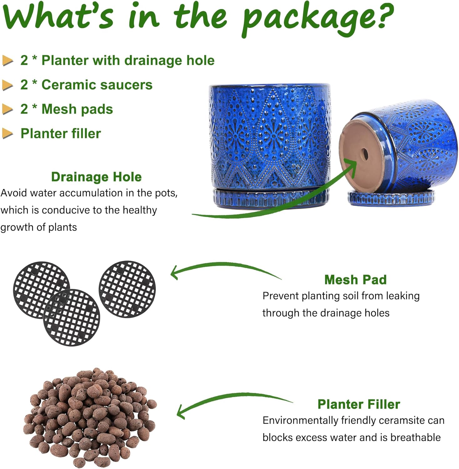 • Size & Package : 8 Inches + 6 Inched plant pot. Package: contains 2 ceramic flower pots, 2 ceramic saucers and 2 mesh pads(NOT INCLUDE PLANTS)