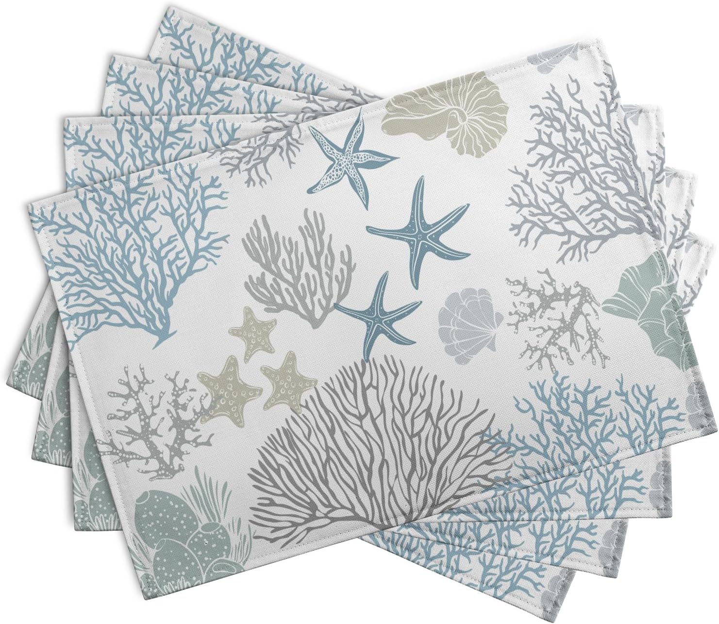Summer Linen Placemats Set of 4 Nautical Coastal Theme Washable Non-Slip Heat Resistant Table Place Mat 12×18 Inch Ocean Beach Blue Grey Coral Starfish Place Mats for Kitchen Dining Table