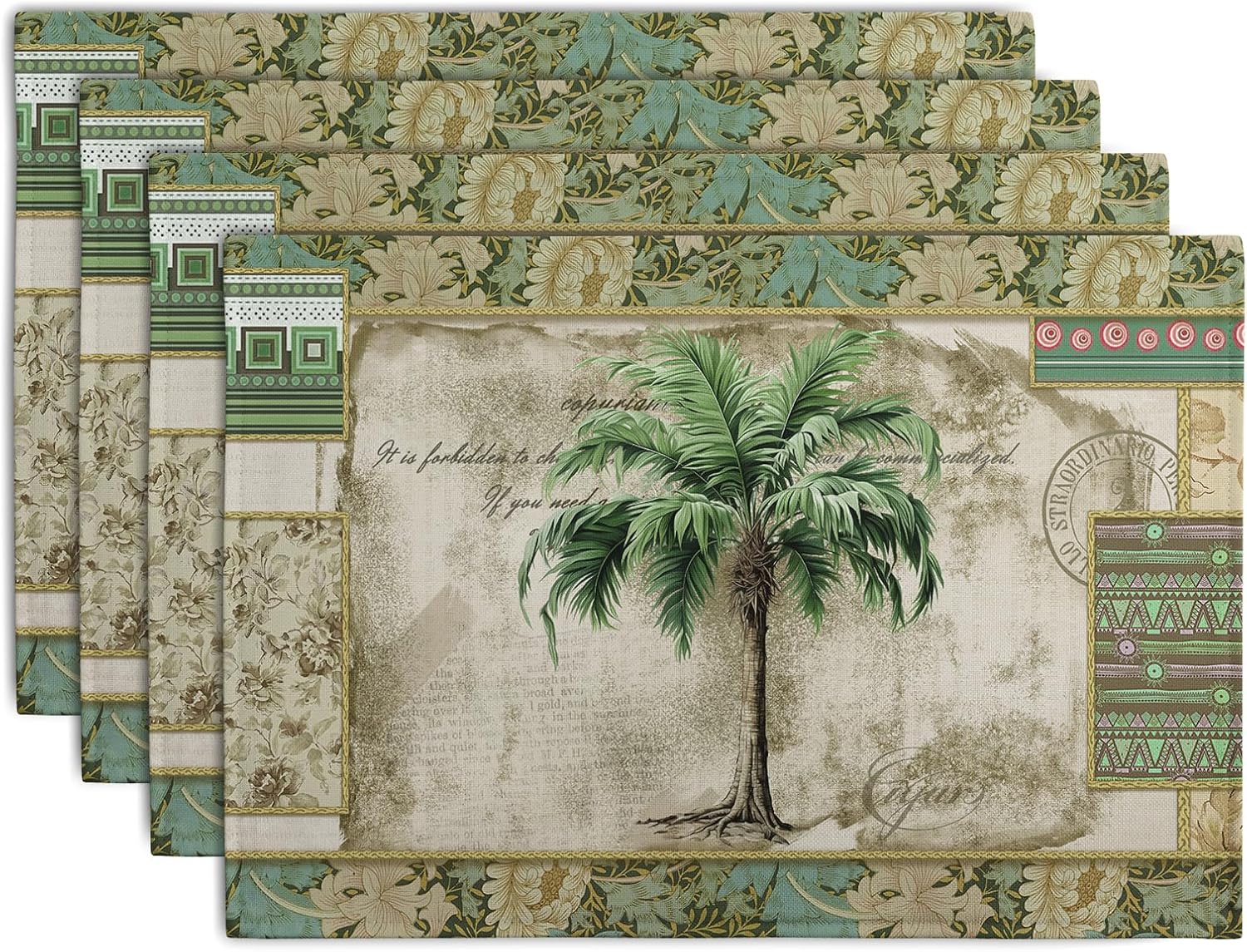 Tropical Palm Tree Placemats Set of 4 Summer Vintage Green Leaf Kitchen Table Mat 12x18 Inch Hawaii Beach Jungle Plant Tree Heat Resistant Washable Linen Place Mats for Dining Tables