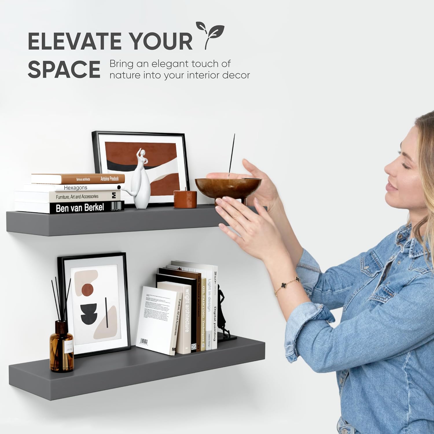 Homeforia 24inch Gray Floating Shelves for Wall, High End Solid Real Wood 24in Floating Shelf for Bathroom, Grey Wooden 24 inch Long Floating Shelves, Heavy Duty Bracket, 24 X 6.5 X 1.75 in, Set of 2