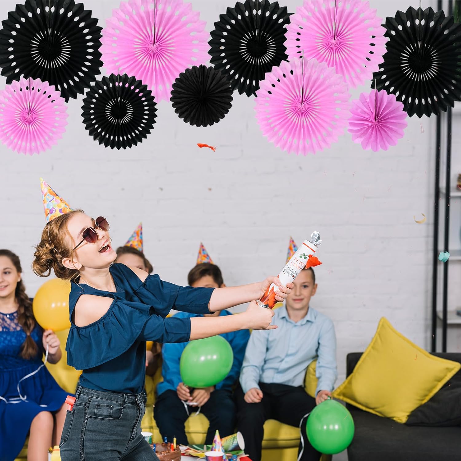 • 【Hanging decoration kit】: includes 10 paper flower fans of 5 sizes, among which the paper flower fan size is 16 inches * 2, 12 inches * 2,10 inches * 2, 8 inches * 2,6 inches*2, color include pink,black.