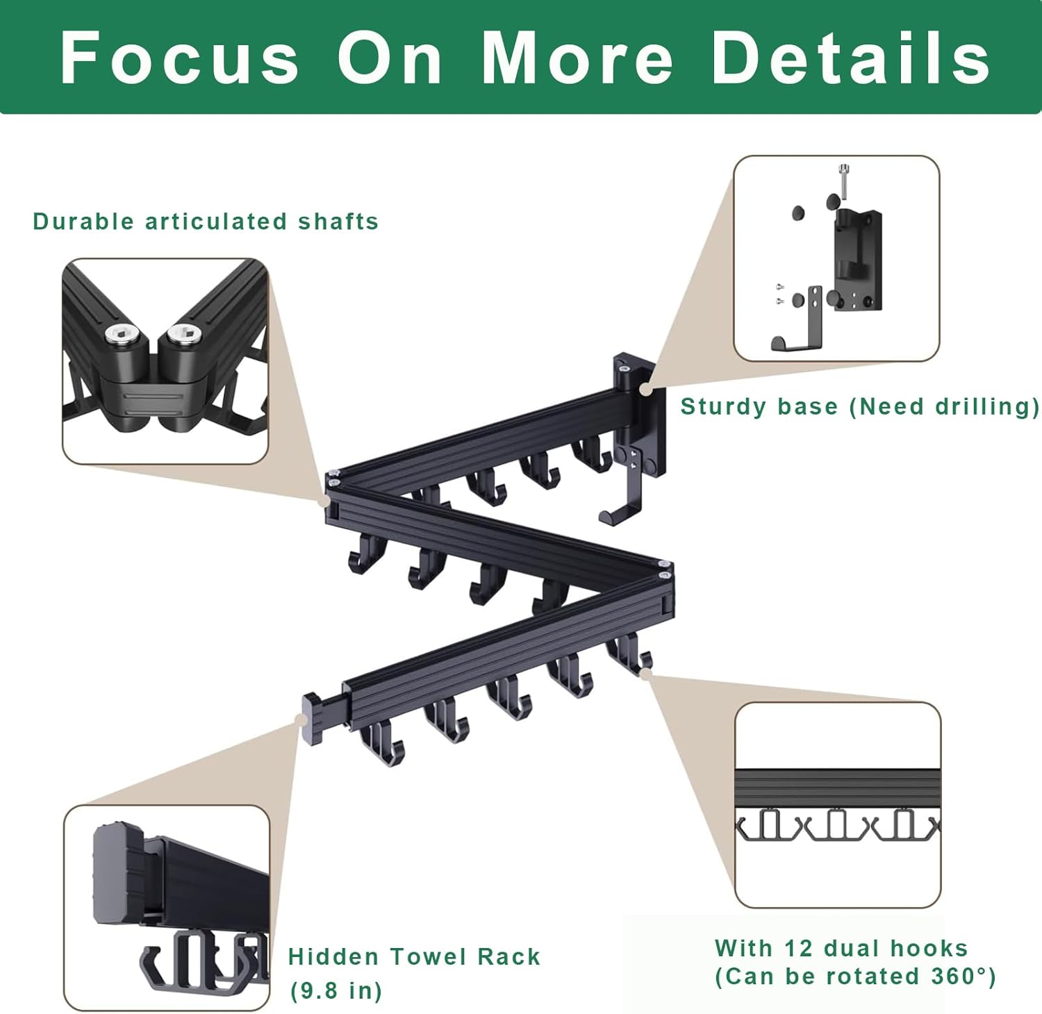 • ✅ Upgrade Dual-J-Shape Hooks Design -- Our clothes drying rack features an innovative design with 12 dual J-shaped & circular hooks, providing you with versatile hanging options. The additional large hooks and extendable rods make it easy to hang a variety of items with ease. Maybe you will fancy this wall-mounted clothes rack, as it brings convenience and efficiency to your daily life.