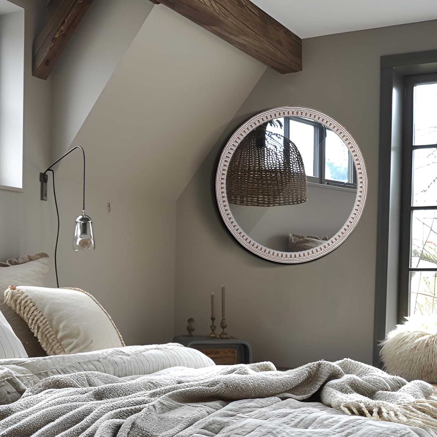 • Rustic Farmhouse Design: This 24-inch decorative all mirror features a wooden round frame with bead accents, bringing a touch of rustic farmhouse charm to your living room, entryway, or bathroom. The distressed finish adds character and warmth to any space.