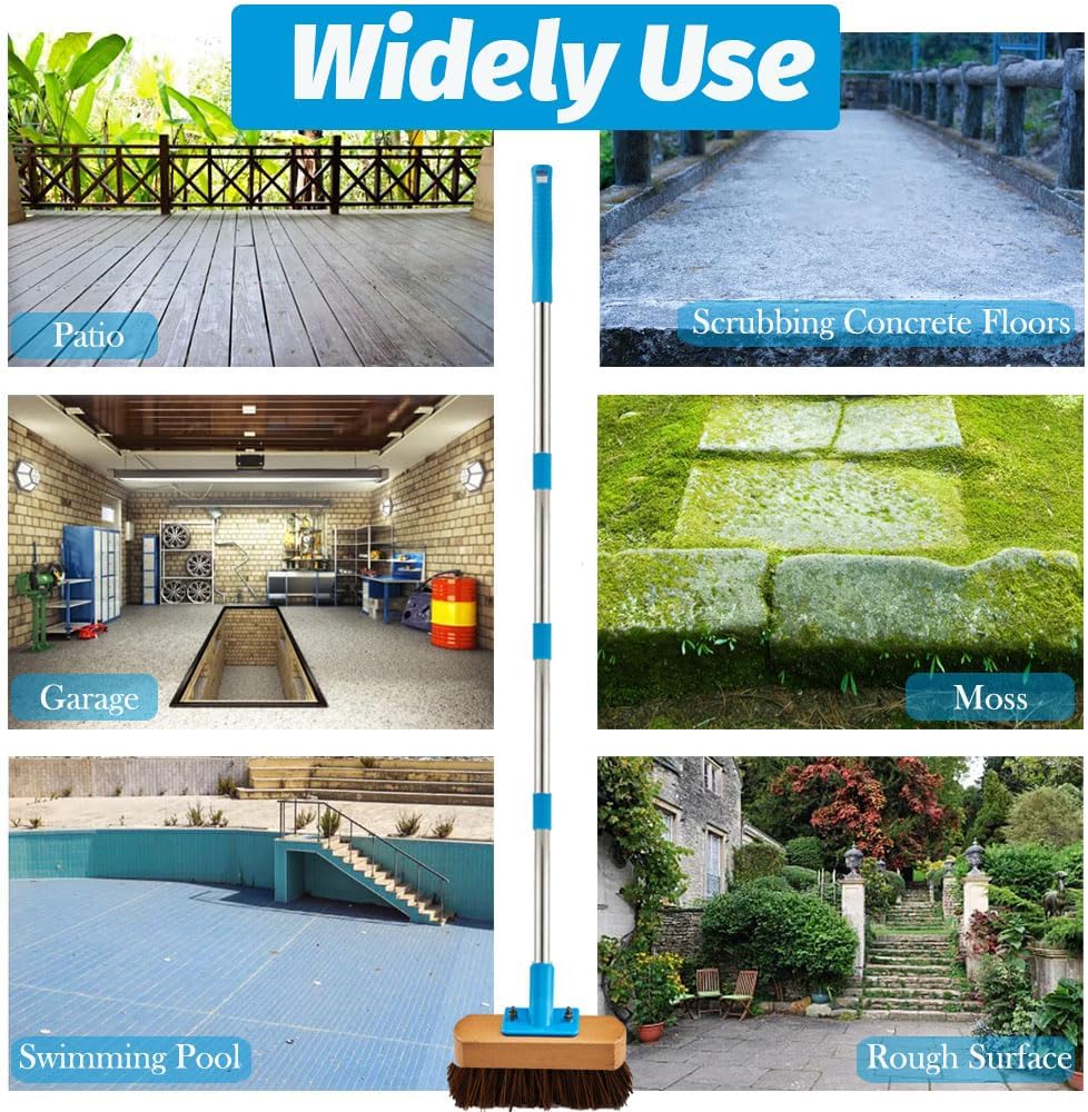 • HEAVY DUTY DECK BRUSH: The outdoor deck brushes for scrubbing heavy duty is consist of high-quality wooden base, dense natural palmyra bristles, paired with 4 stainless steel poles. Easy to install and disassemble, doesn't take up space. Best moss and dirt remover tool from rough surface. Ideal heavy duty deck brushes for scrubbing outside