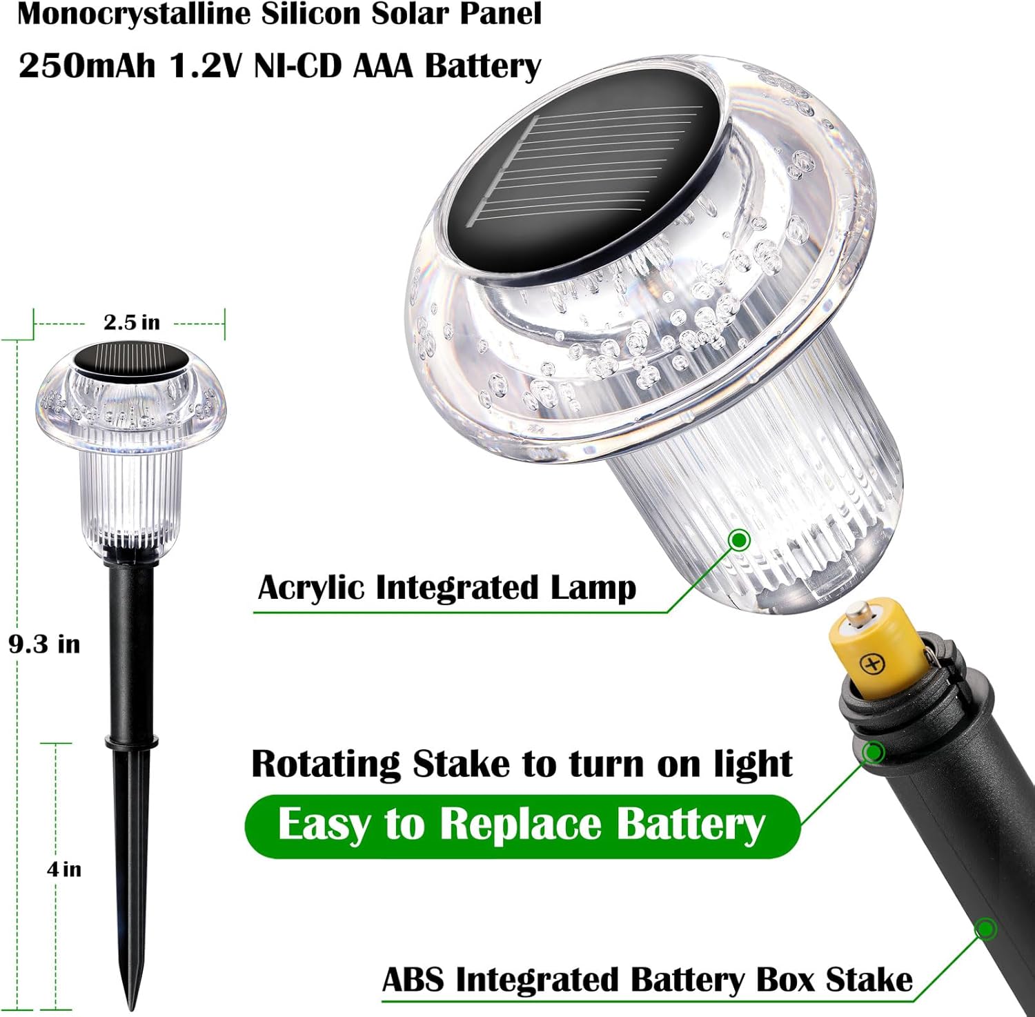• HIGH EFFECT: Solar pathway lights outdoor adopts monocrystalline silicon solar panel and contains 1.2 V 250 mAh Ni CD AAA Battery. They automatically charge during the day, over a period of 4-6 hours. Then, they turn on automatically at night, providing at 6-8 Hours of lighting.