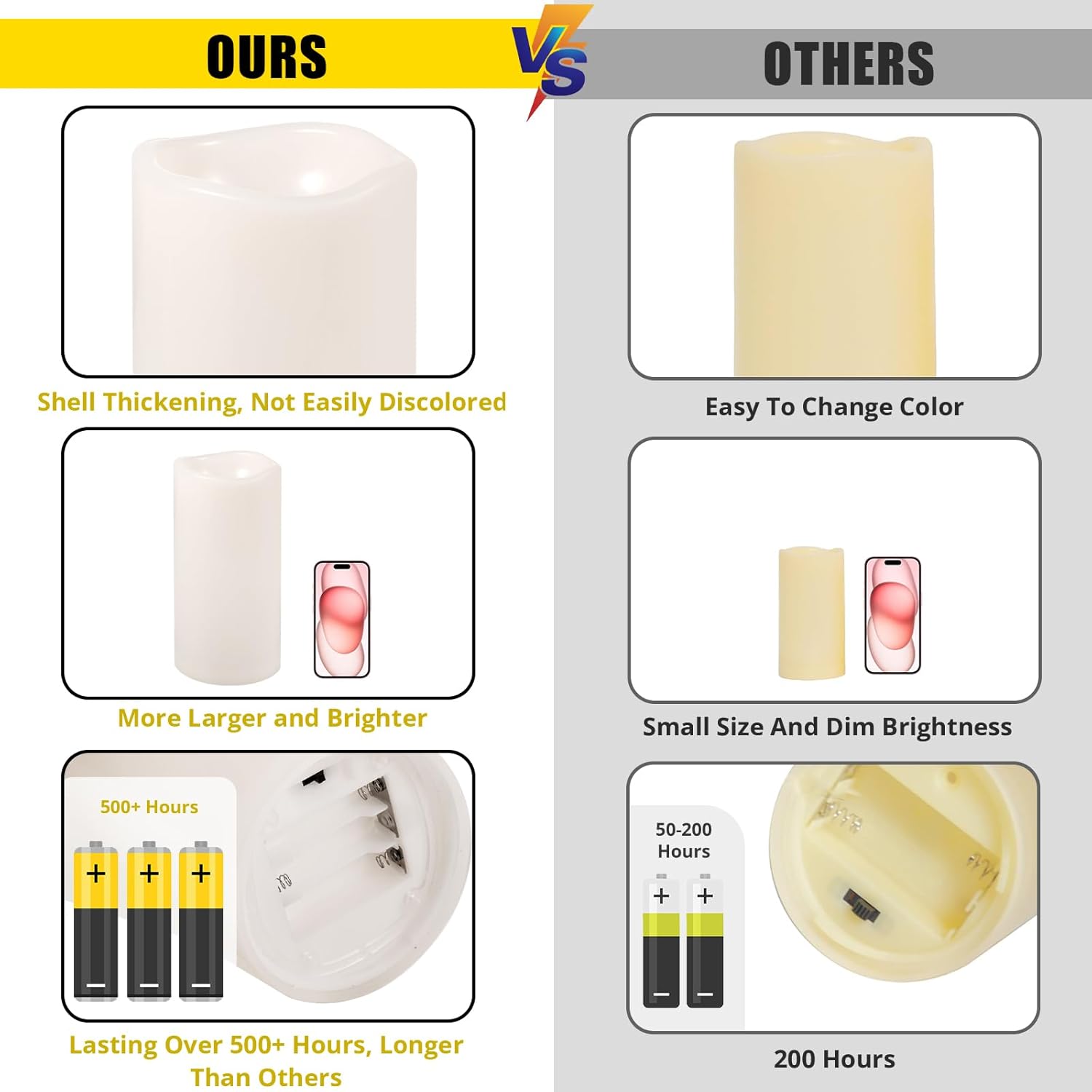 • LONG-LASTING GLOW WITH WARM LIGHT: Our remote candles adopt LED bulbs that emit a bright warm yellow light, with a flickering glow like real natural candlelight. Each candle requires 3 x AA batteries (not included), and with premium batteries, the battery candles can provide continuous lighting for over 500 hours or up to 45 days with high-grade batteries in a 6-hour timer.180-day after-sales guarantee and 24-hour customer service to assist with any questions or concerns