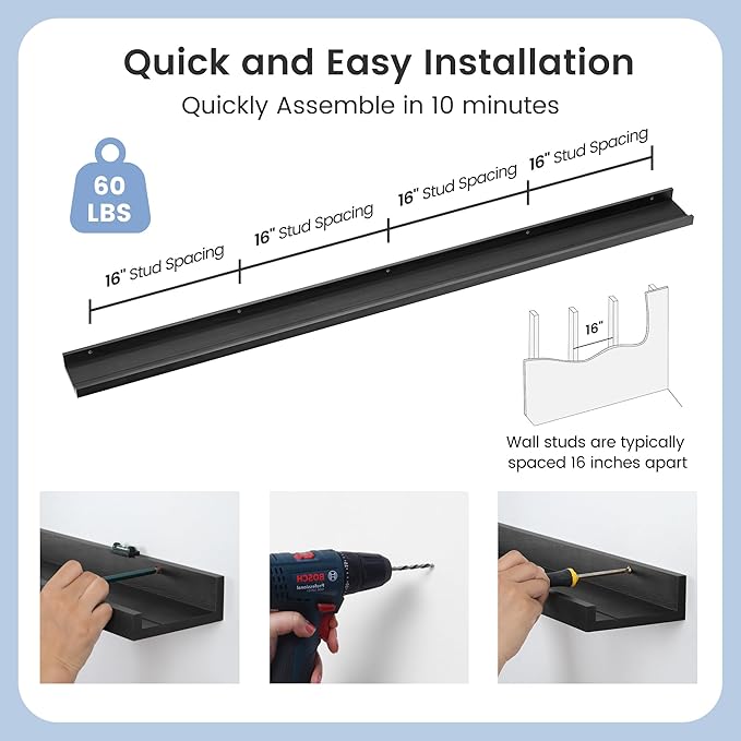 • Easy to Install: You will get a level, screws for the wall, drywall anchors, a detailed installation guide, and two beautiful hand-crafted solid pine wood shelves. With the level, you can make sure your picture ledge shelves are well aligned. Just follow the simple instruction to install the hanging shelves for wall decor within 10 minutes. We add additional screw and anchor to the hardware bag just in case. If you have any questions about our products, please feel free to contact us