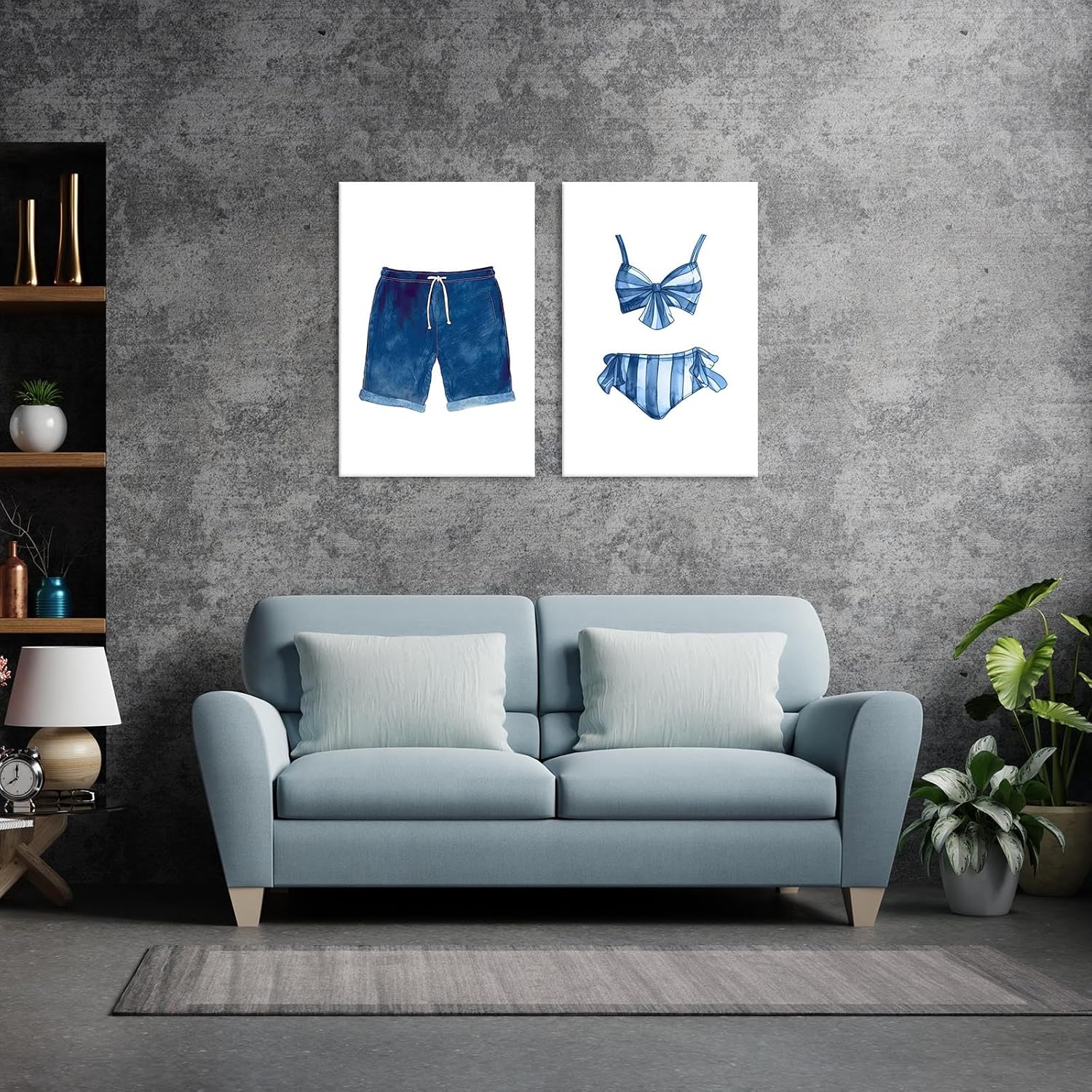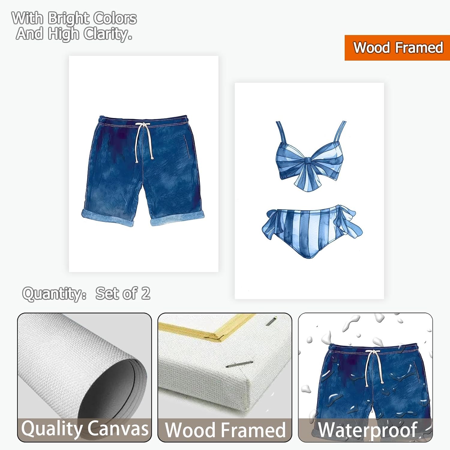 Liyark Set of 2 Retro Navy Blue And White Swimsuit Art Posters Beach Bathing Suit Prints Painting Beach House Wall Art Coastal Wall Decor Pictures For Bathroom Home Decoration 12x16in Framed