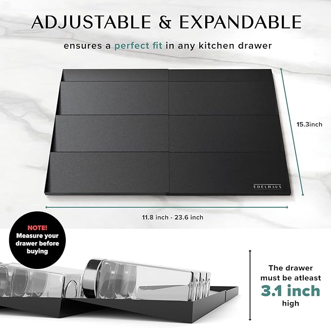 • EXPANDABLE SPICE RACK FOR DRAWER: Our spice rack drawer organizer consit of 2 pieces and adjusts from 11.8" to 24" wide, fitting most drawers and cabinets. Each spice drawer insert measures 11.8W x 15.4L x 1.1H inches.