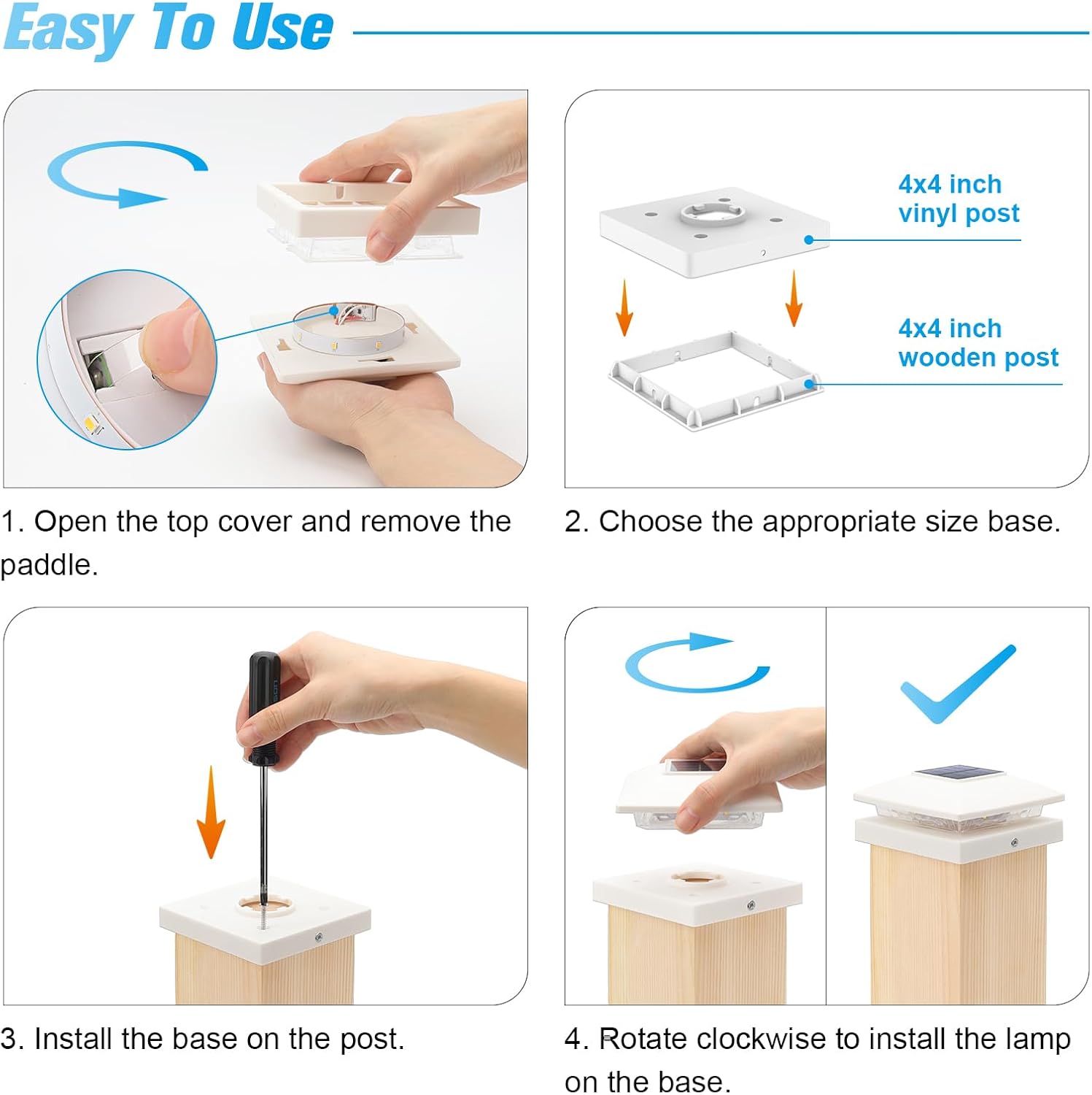 • 【Easy Installation】Each package contains 2 bases (4x4 wooden post and 4x4 vinyl post) and 12 screws. Choose the appropriate base size and place it on the corresponding post, then screw the two screws into the post through the small holes on both sides of the base. The solar fence post cap light is charged in sunlight for 6-8 hours during the day and automatically turns on for 10-12 hours at night