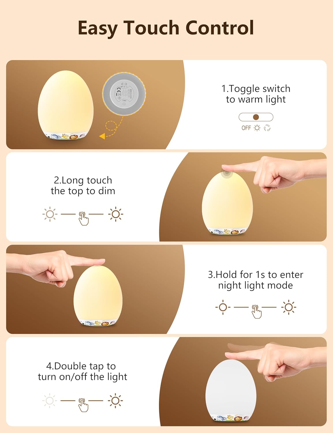 • Easy Touch Control: Long press the top for stepless dimming; Tap the top twice to turn on/off the light; hold the top 1.5s to enter night light mode for late night feeding and diaper changings
