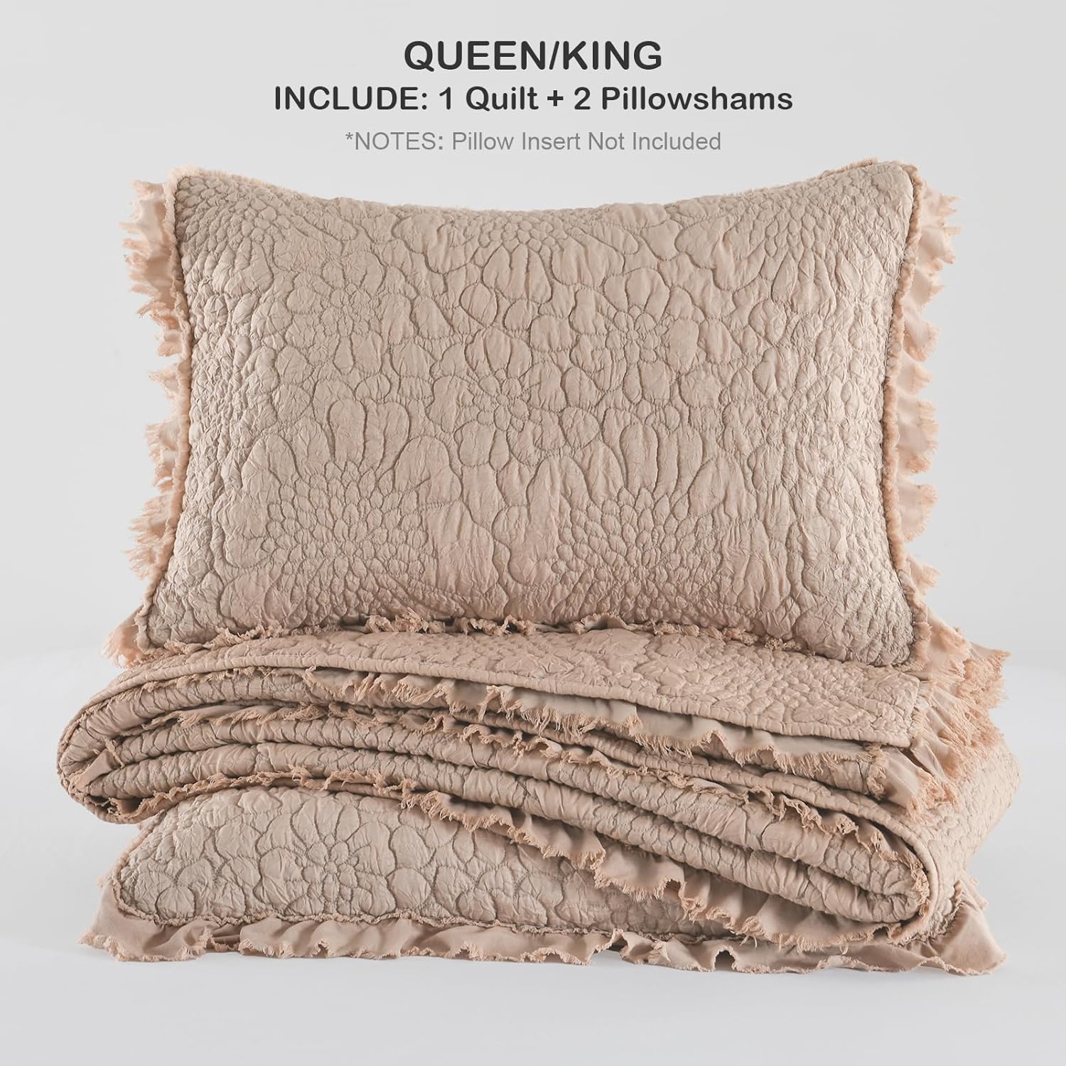 HORIMOTE HOME Pinkish Grey Ruffled Quilt Queen Size, Stone-Washed Lightweight Crinkled Farmhouse Rustic Shabby Chic Bedding Set, 3 Pieces Reversible Bedspread with Pillow Shams for All Season