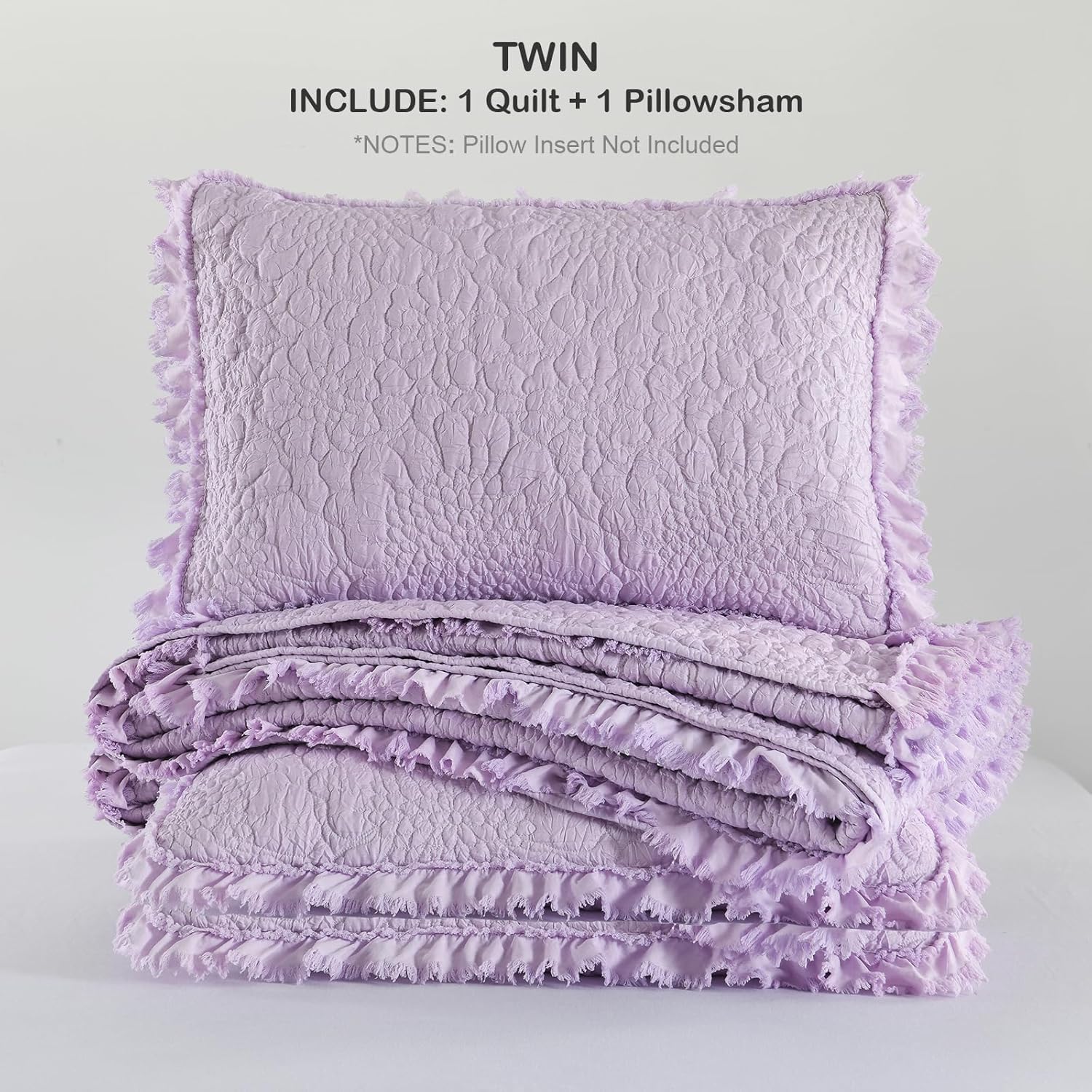 HORIMOTE HOME Lavender Ruffled Quilt Twin Size, Stone-Washed Microfiber Lightweight Crinkled Farmhouse Rustic Shabby Chic Bedding Set, 2 Pieces Reversible Bedspread with Pillow Sham for All Season