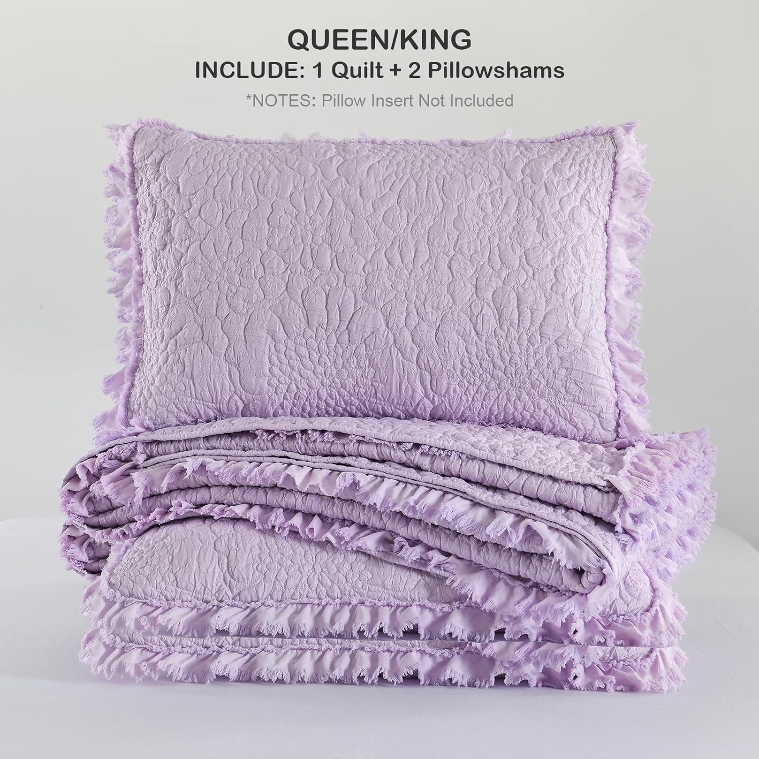 HORIMOTE HOME Lavender Ruffled Quilt King Size, Stone-Washed Microfiber Lightweight Crinkled Farmhouse Rustic Shabby Chic Bedding Set, 3 Pieces Reversible Bedspread with Pillow Shams for All Season