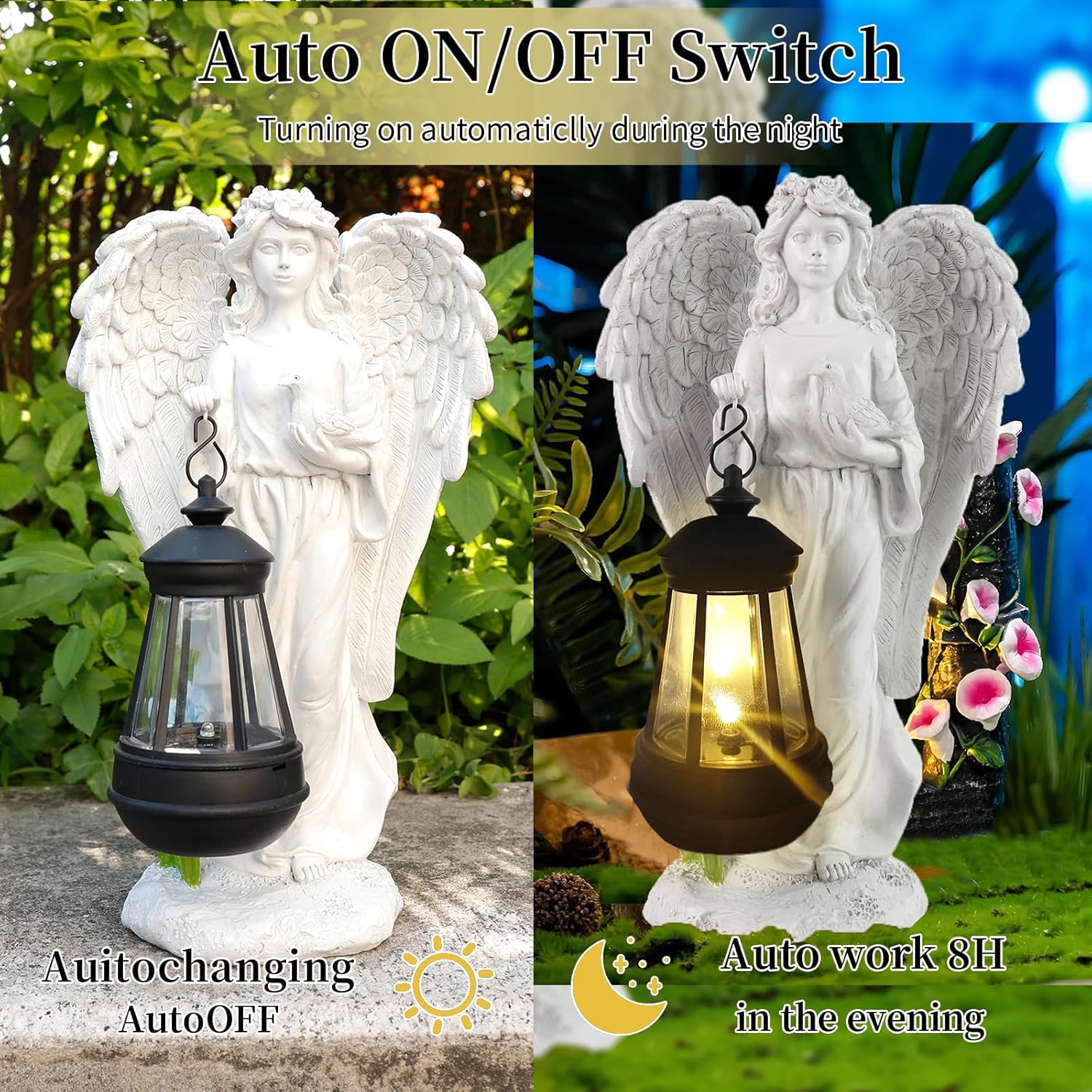 • ♥️【Easy to Use】Powered by Solar Light,Just turn the bottom switch to "ON" to start the timer automatically. The solar panel will then charge, and your angel statue will light up automatically at night, creating a hassle-free outdoor decoration experience.