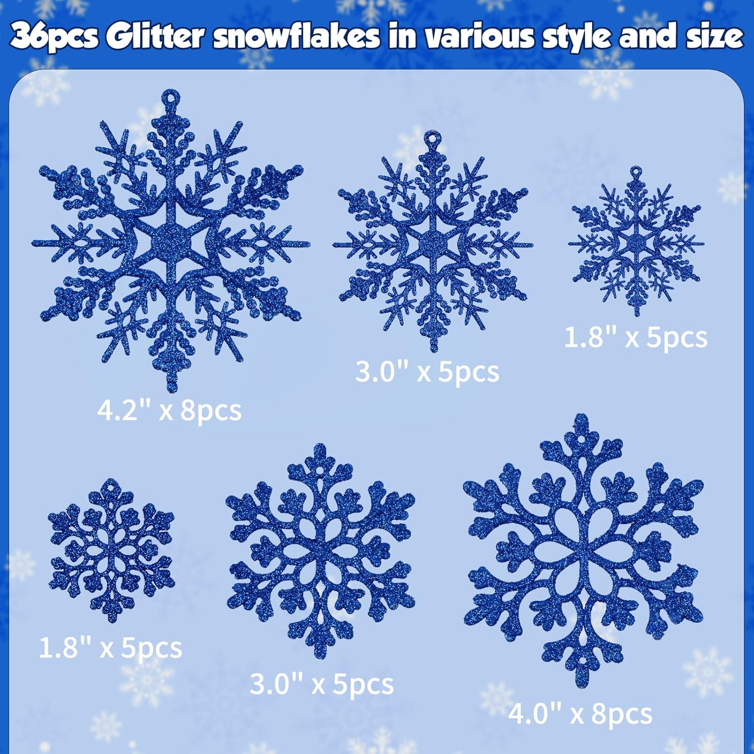 • SNOWFLAKES OF VARIED SIZES: A value pack of 36pcs navy blue Christmas glitter snowflakes in 4 varied sizes and 2 different patterns: 8pcs for 4.2 inch, 8pcs for 4 inch, 10pcs for 3 inch for both styles and 10pcs for 1.8 inch for both styles. It’s a lot of snowflakes sufficient for your Christmas decorations.
