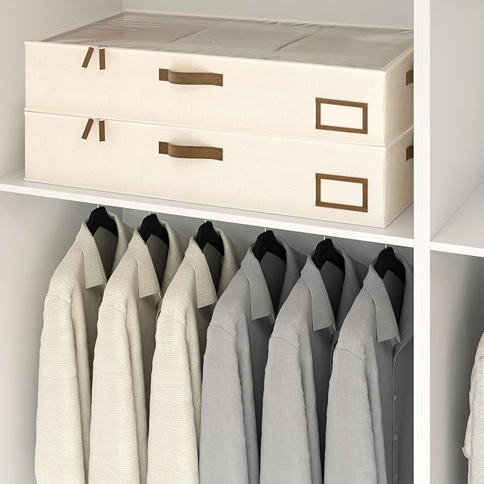 Under Bed Storage Containers, 2-Pack Underbed Storage Box, Collapsible Clothes Storage Bins with Handles and Lid, Large Under Bed Organizers for Shoe, Blanket, Toy, Pillow, Sheet, Beige