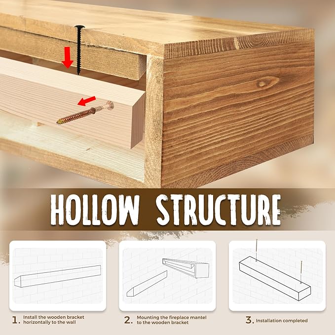 • Easy Installation: Our solid wood mantels come with hidden wood brackets, which can be easily fixed to the wall. Our hollow structure design ensures easy installation. The package includes installation instructions and two sets of accessories, compatible with hollow walls (drywalls) and solid walls (brick walls). For any installation issues, feel free to contact us at any time