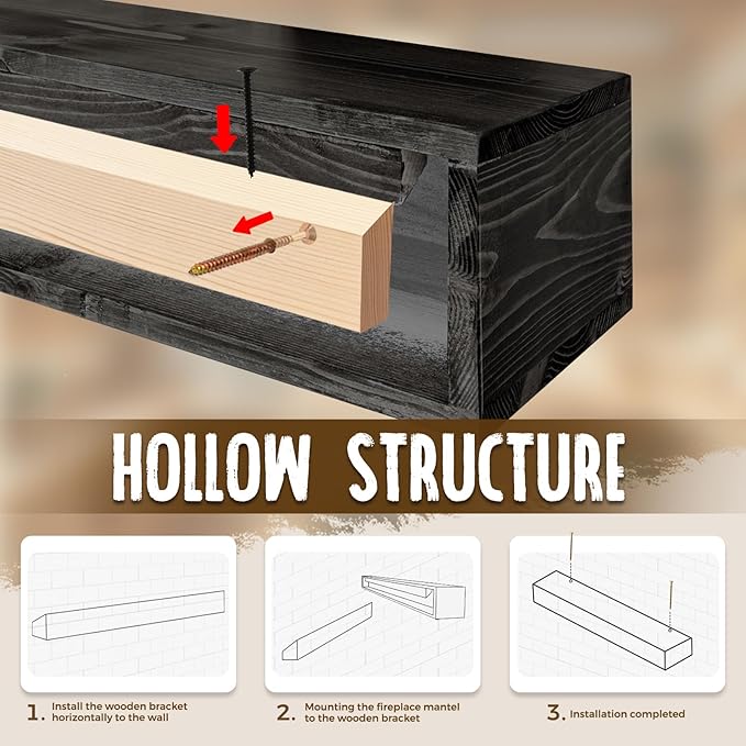 • Easy Installation: Our solid wood mantels come with hidden wood brackets, which can be easily fixed to the wall. Our hollow structure design ensures easy installation. The package includes installation instructions and two sets of accessories, compatible with hollow walls (drywalls) and solid walls (brick walls). For any installation issues, feel free to contact us at any time