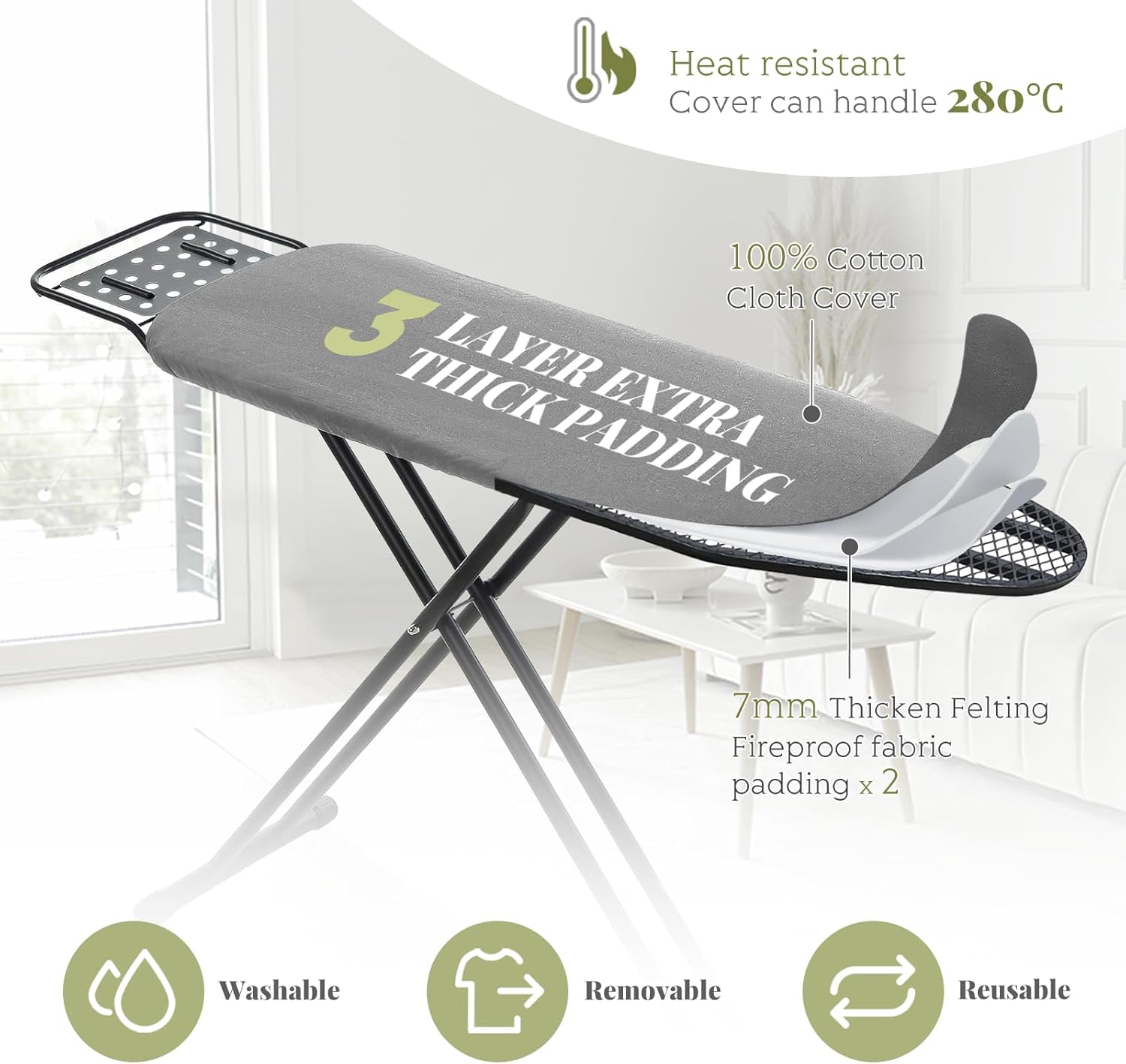 • Iron Board Cover with Padding: The ironing board cover is made of 100% cotton; It's removable, washable, and reusable, and it comes with 2 layers of 7 mm thick pads made of fireproof fabric; The extra thick cloth cover ensures you an extraordinary ironing experience