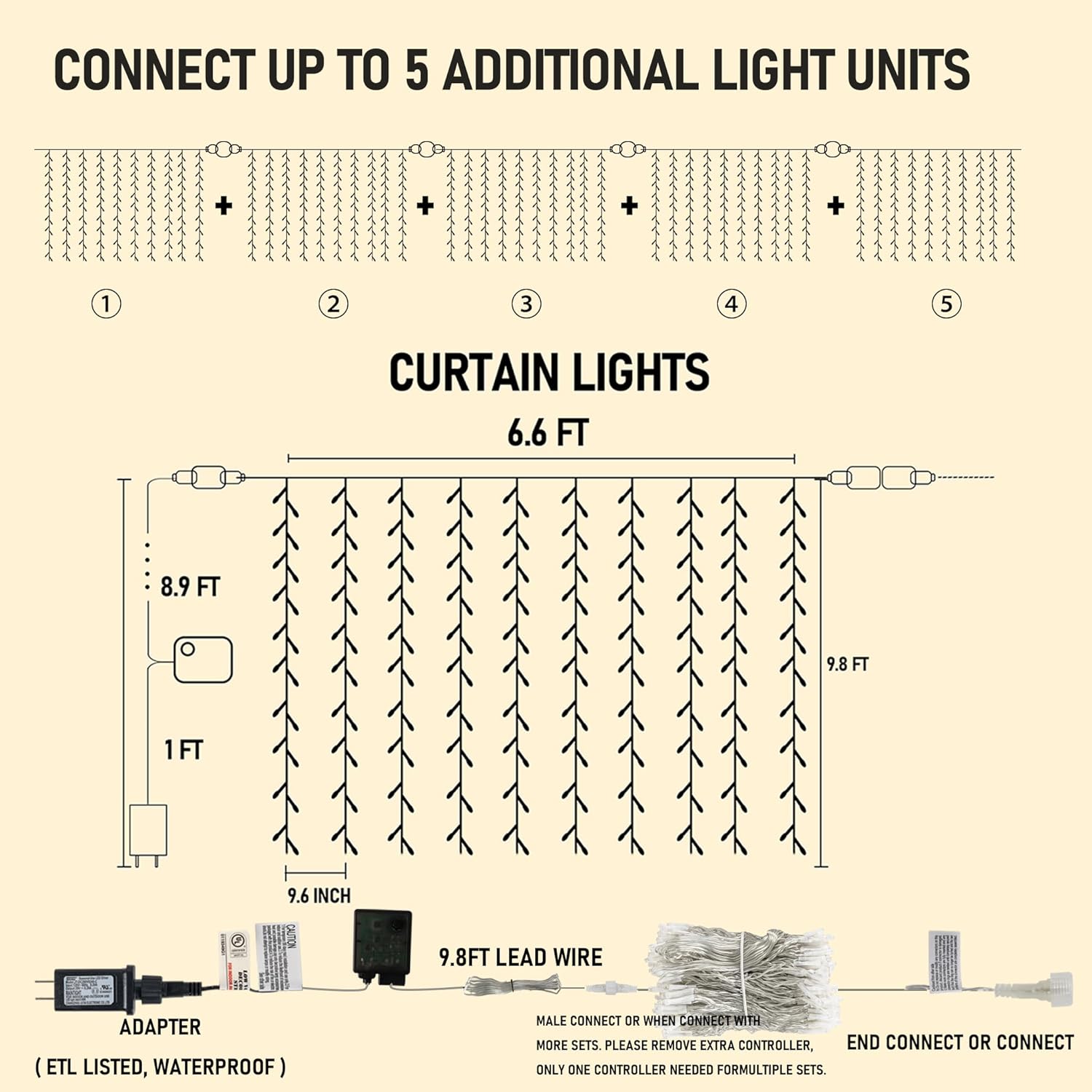 • 300 LED Curtain Lights: Our 9.8x6.6FT 300 LED curtain lights offer a stunning display of warm white fairy lights, featuring 10 light strands with 30 LED lights on each string. The size of the lights are perfect for covering large windows and walls, creating a breathtaking light show. The 9.8ft lead wire offers added support for outdoor use. Designed to be connectable, you can connect up to 5 sets of these string lights together to cover larger areas