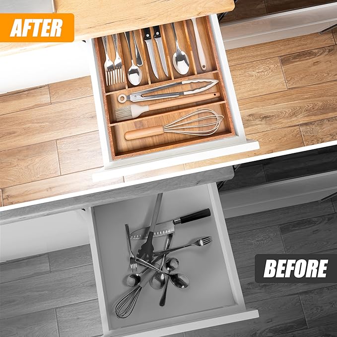 • ✅【Deep Compartments & Reinforced Base】Our utensil drawer organizer features compartments with a depth of 1.9 inches, helping maximize drawer space and perfect for storing more essential tools and gadgets. The utensil silverware drawer organizer flatware cutlery tray comes with a reinforced base, ensuring durability for long-term use, and is ideal for supporting the weight of heavy-duty utensils and knives. Keep everything you need conveniently at hand while cooking, neatly visible, and easy to grasp when preparing the next meal in the kitchen.