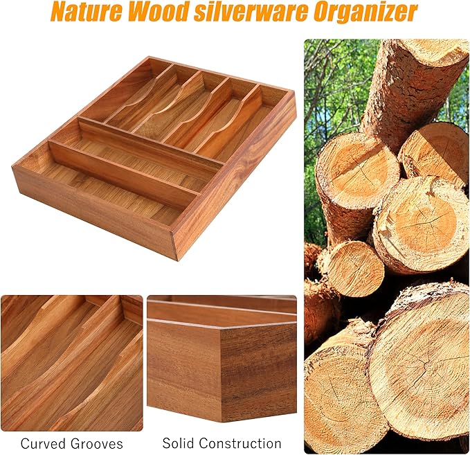 • ✅【Perfect premium bamboo】Our utensil silverware drawer organizer flatware cutlery tray is crafted from natural bamboo that has been grown for over 4 years. Each silverware drawer organizer made of bamboo is meticulously handcrafted by seasoned artisans to ensure a smooth, splinter-free surface. You can confidently allow your family or children to use our silverware drawer organizer. Unlike plastic and metal drawer organizers, our utensil holder is water-resistant and odor-resistant, making it perfect for long-term use.