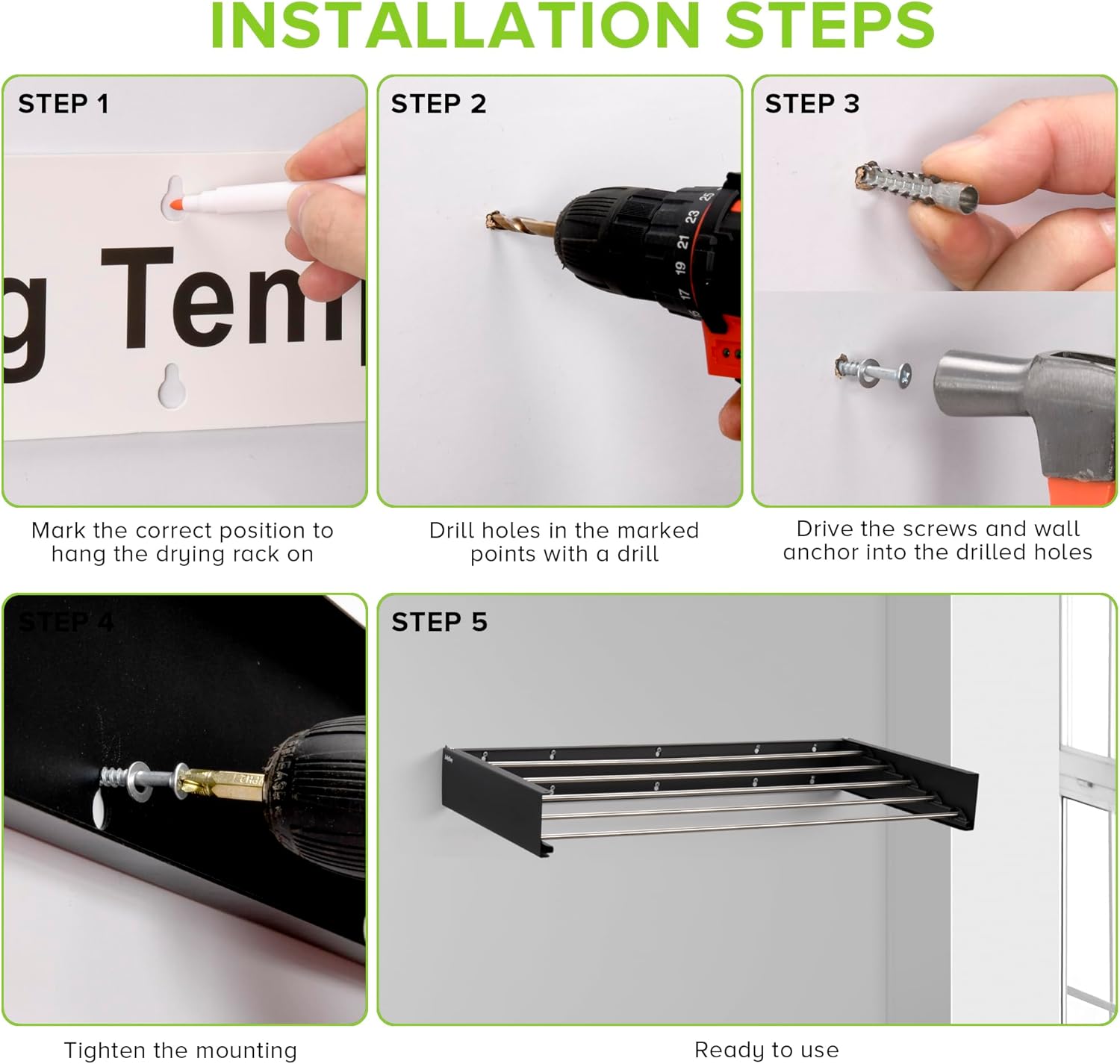 • Laundry drying rack includes an installation manual, accessories bag, and borehole locator paperboard for easy setup. In just minutes, you'll have a functional and dependable collapsible clothes drying rack.