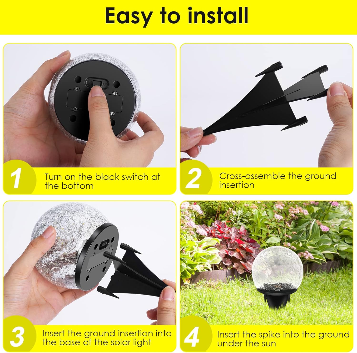• 2 Easy Install Way: Solar powered, no battery or outlet needed, super convenient to use. It just need only 10-15 seconds to install the solar lights on places it absorb full and direct sunlight. The solar globe lights outdoor can be placed on the table, floor or inserted into the ground with a plug-in board. Try to soften the ground with water and dig a suitable hole for the spike if the ground is too hard