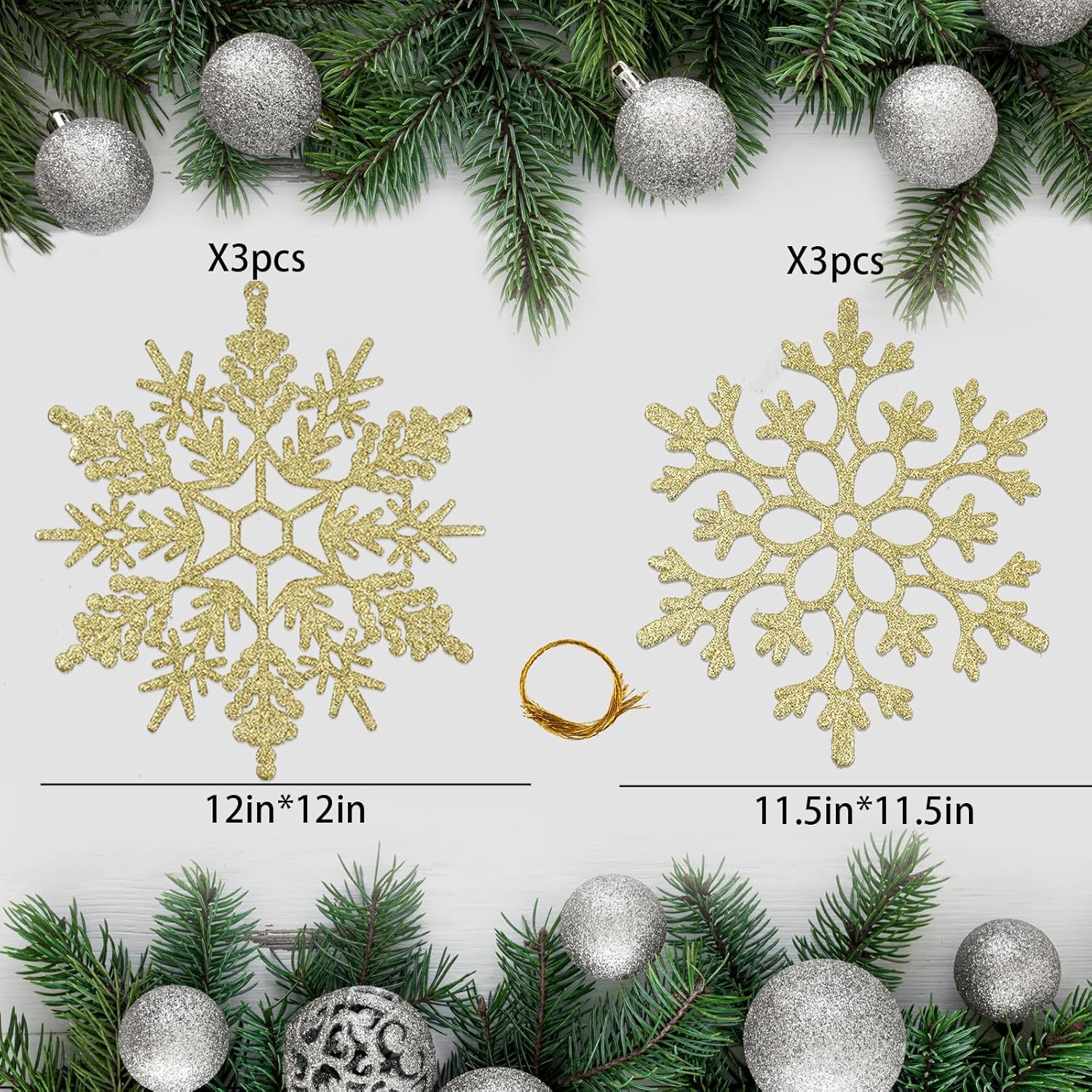 • LARGE SNOWFLAKES: Pack of 6pcs big gold snowflakes in two different styles measuring about 12" and 11.5" in height, large size snowflakes ornaments great for both indoor and outdoor winter Christmas decorations