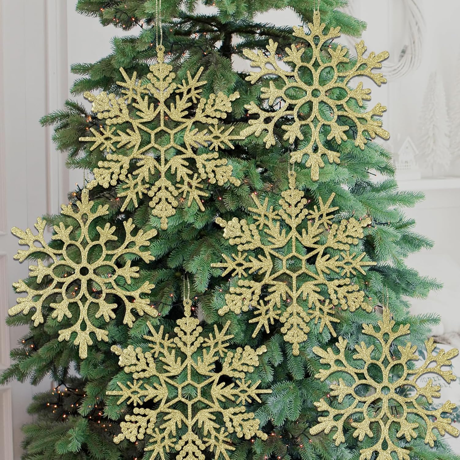 • SNOWFLAKES FOR CHRISTMAS: Featuring sparkly glitters on the surface, these gold glitter snowflakes tree ornaments add much more sparkle to your Christmas tree decorations, they also look gorgeous on windows, ceiling, fireplace, outside yard, porch etc, perfect winter decorations snowflakes; Besides, they are excellent for frozen theme birthday party, winter wonderland birthday party decorations.