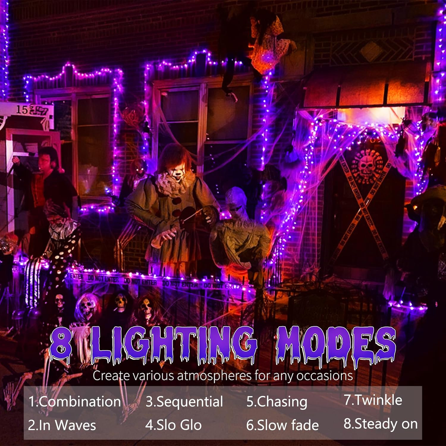 • 8 Lighting Modes purple Halloween Lights: These mini globe Halloween lights feature 8 lighting modes, including Combination, In waves, Sequential, Slow Glow, Chasing/Flash, Slow fade, Twinkle/Flash, Steady on. Just press the round button on the adapter to set up your mode to fit your Halloween/holiday party decor or light up a unique outdoor/indoor illuminated backdrop for your vivid and funny decorations.