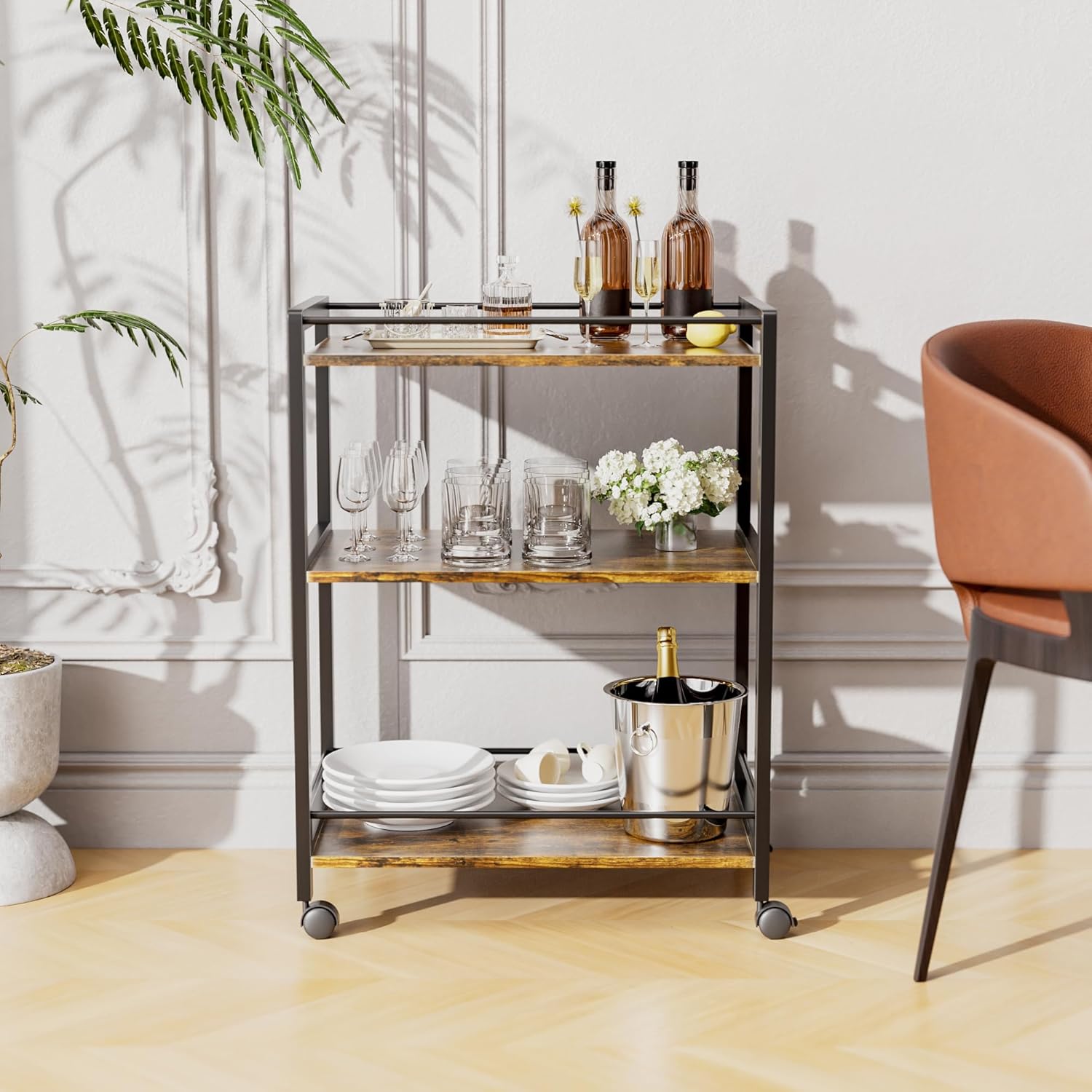 • LARGE CAPACITY, 3 TIERS BAR CART WITH STORAGE - The kitchen trolley on wheels with 3 wide open shelves provide ample storage space for liquor, wine glasses, fruit, snacks, cutlery, ice buckets, put all your favorite beverages on it and enjoy relaxing home bar time. Size: 25.2"W x 15.75"D x 33.46"H