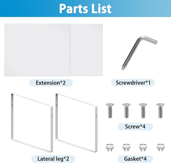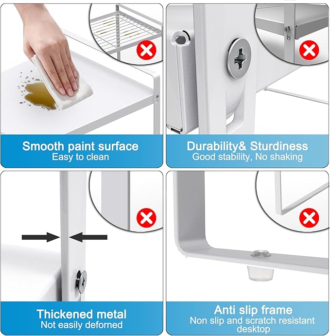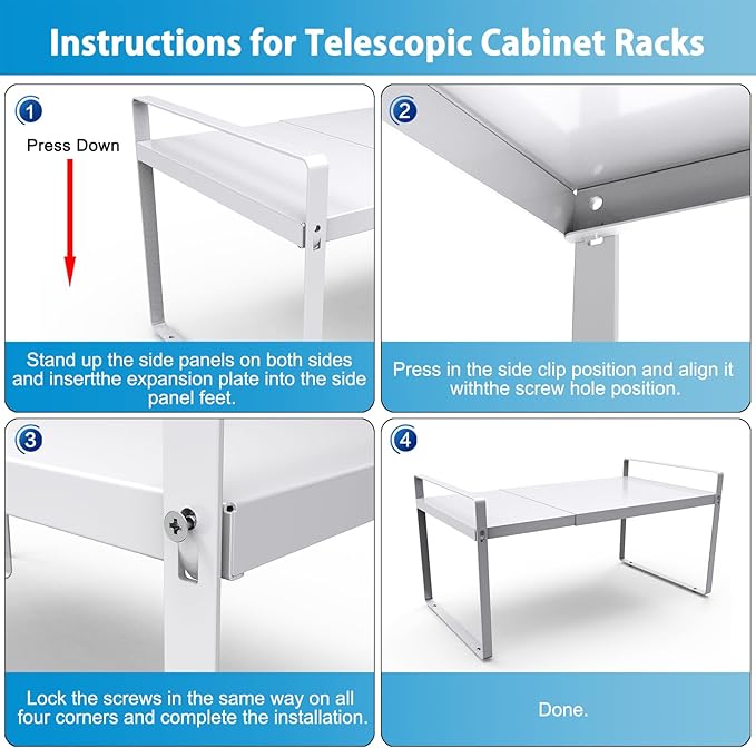 • Easy to Install:Easy to assemble with a clear manual. Comes with accessories and step-by-step instruction, it will be easy for you to install this storage shelves , no drilling needed! We use non-slip suction feet to prevent the countertop organizer from sliding the table.The package includes extension*2 ,lateral leg*2,screw*4,gasket*4 and screwdriver*1