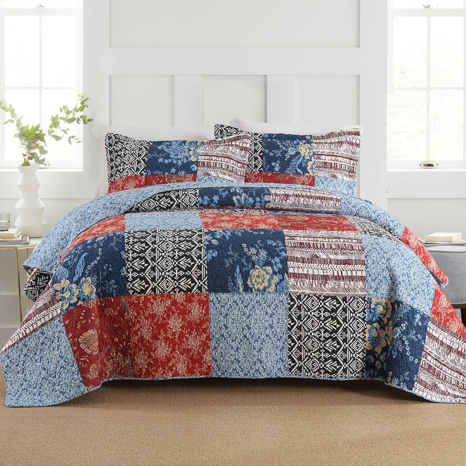 Secgo Queen Comforter Set for Bed - 100% Cotton Quilts Queen Size, Black Bedspreads (90 * 98 Inch) with 2 Pillow Shams, Patchwork Reversible Lightweight Bedding