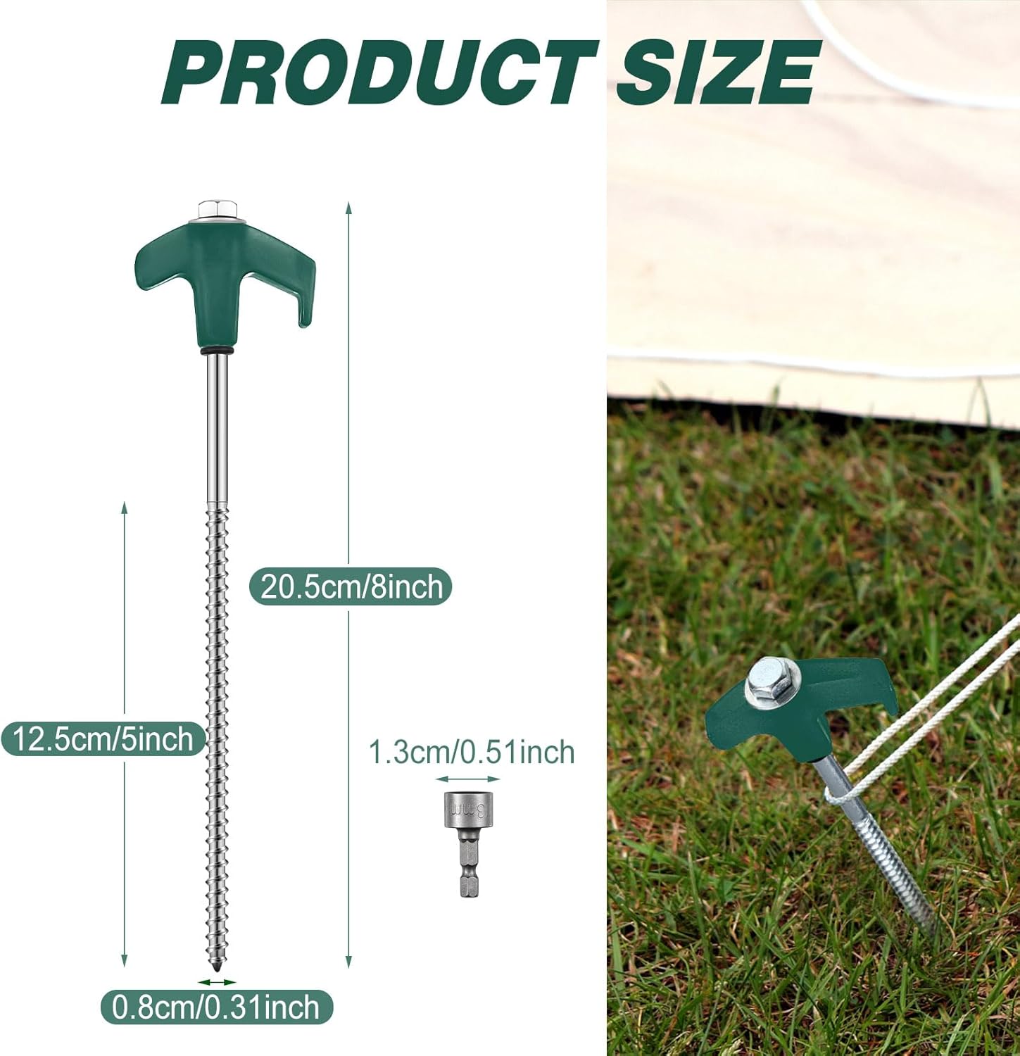 • Sufficient Quantity: you will receive 10 pieces of metal tent stakes and 1 piece of 0.51 inch diameter hex head driver, enough quantity to meet your applying needs and replacement needs; The stakes are approx. 8 inch/ 20.5 cm long, the thread is approx. 5 inch/ 12.5 cm long and approx. 0.31 inch/ 0.8 cm in diameter