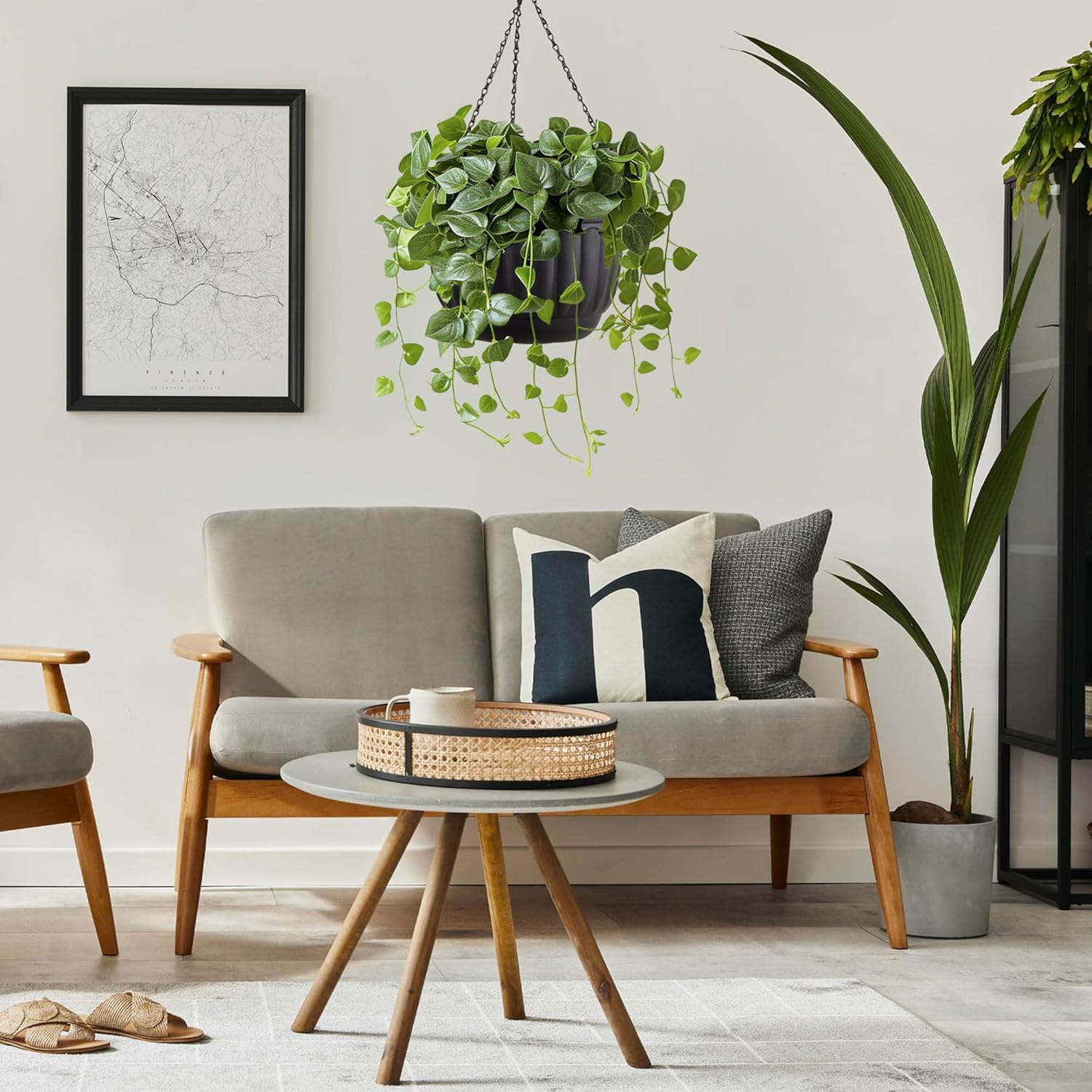 • Ideal Home Decor: Experience modern elegance with hanging baskets for plants indoor. These outdoor planter for porch feature a minimalist design, blending seamlessly with any color or decor. Gardening pots, planter & accessories are perfect for showcasing spider plants, vine plants, ivy, ferns, succulents, flowers, and more, black plastic pots for plants add a touch of simplicity and sophistication to your space.