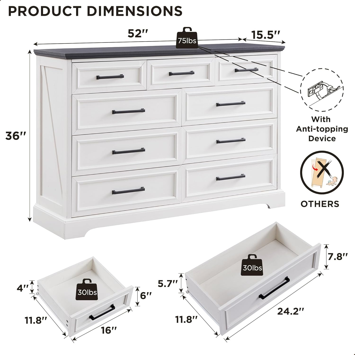 • STURY SUPPORT & ANTI-TOPPING: As a stunning storage furnishing outfitted several drawers, it features a stable base and the extra hidden reinforced protection under the base for a long-term use. There are also anti-topping device on the back panel to prevent it from topping over, adding better safety in your home