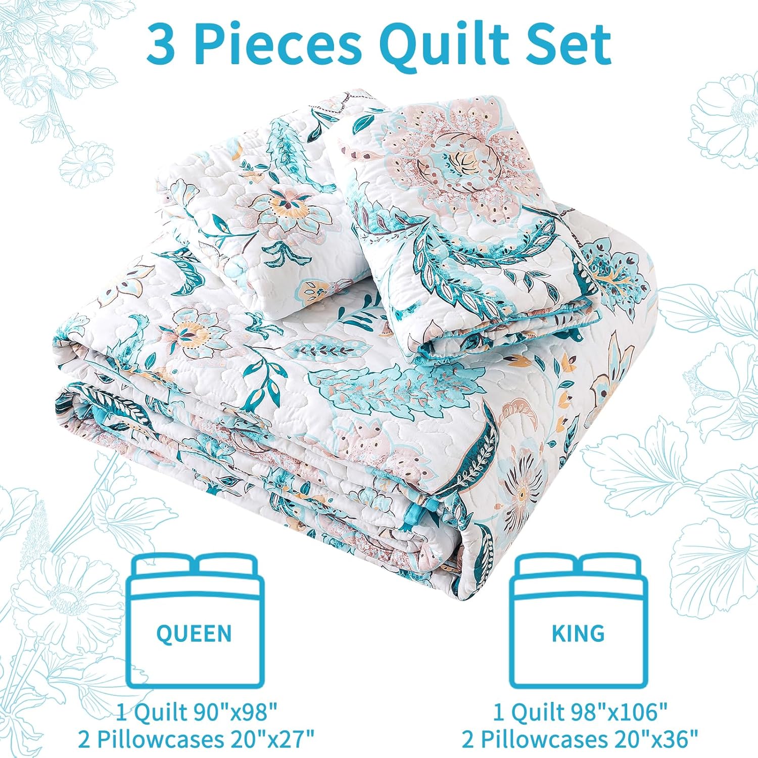 • [Indulge in Luxurious] Garden queen bedspread will give you a cozy and restful night's sleep. This stunning floral queen size quilt set is crafted from soft yet durable microfiber fabric that's sewn tightly for added strength. The lightweight filling and breathability of the fabric will keep comfortable all night long.