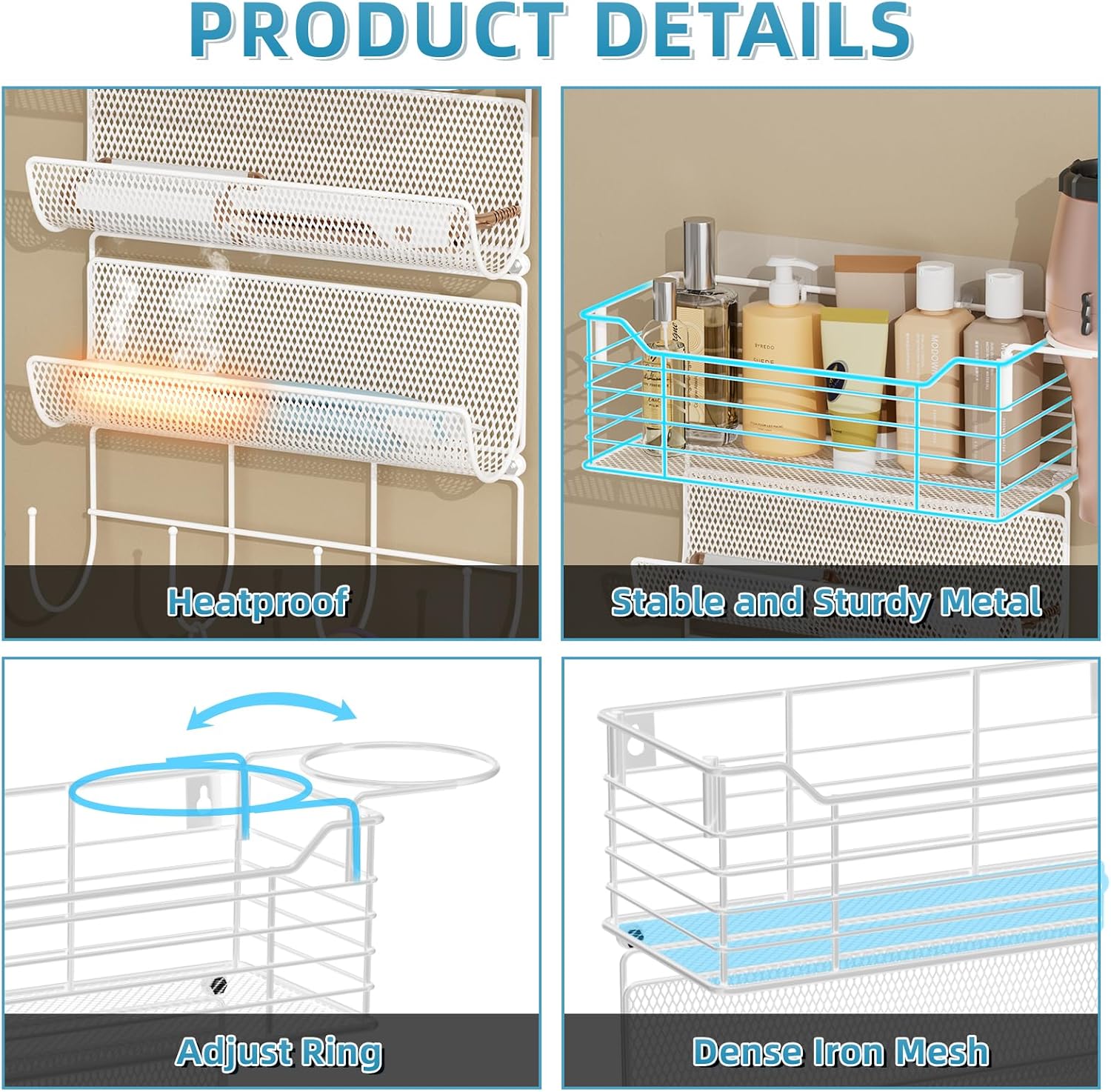 • 【1 Basket/3 tier Shelf】The hair tool organizer includes 1 metal basket, 2 mesh holders, 1 hairdryer holder, and 1-row hook. Separate all your hair tools, such as curling iron, blow dryer, straightener, etc.