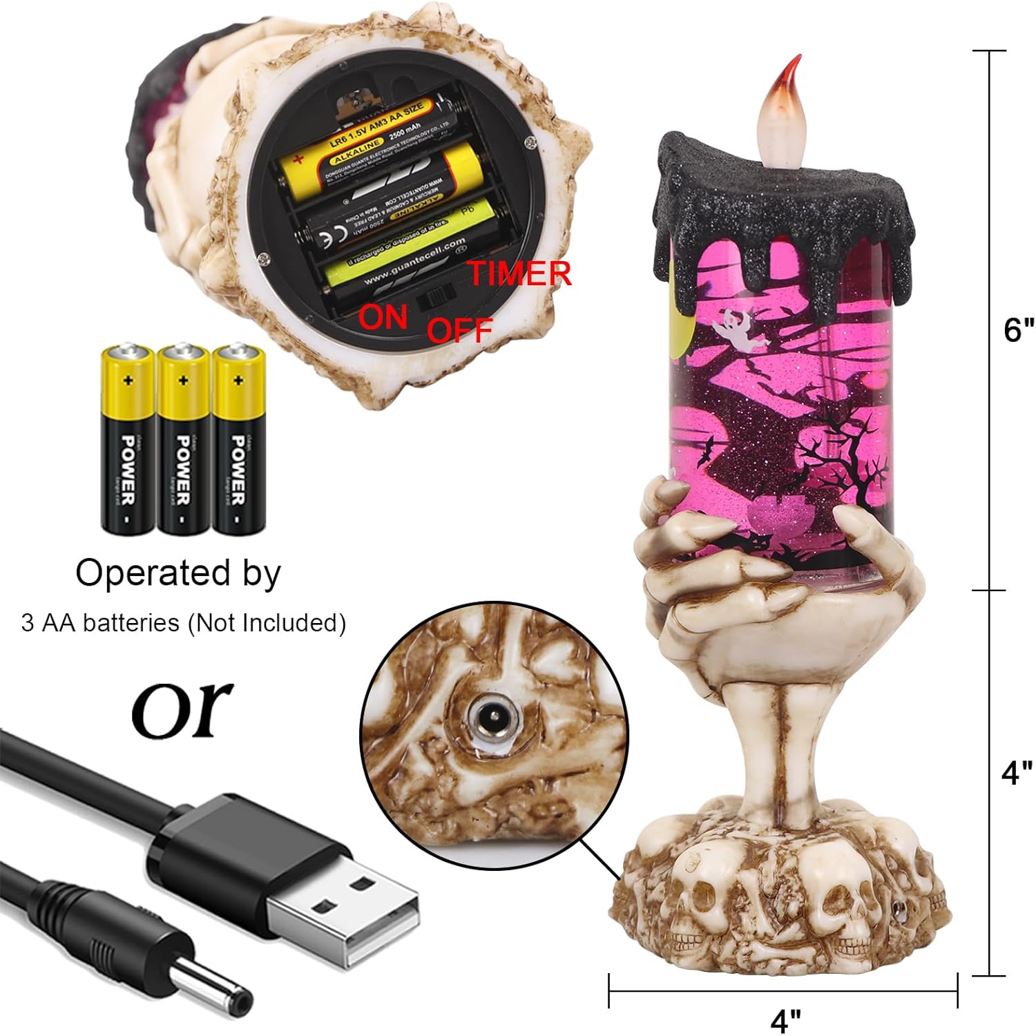 • [SNOW GLOBE CANDLES]: Vivid skeleton hand candle holder grab the lighted snow globe lamp, glittering ghosts and spinning water with yellow lights create a spooky horror atmosphere. Decorate your Halloween in a different way this year, water glittering spinning snow globe candle will light up your whole Halloween season