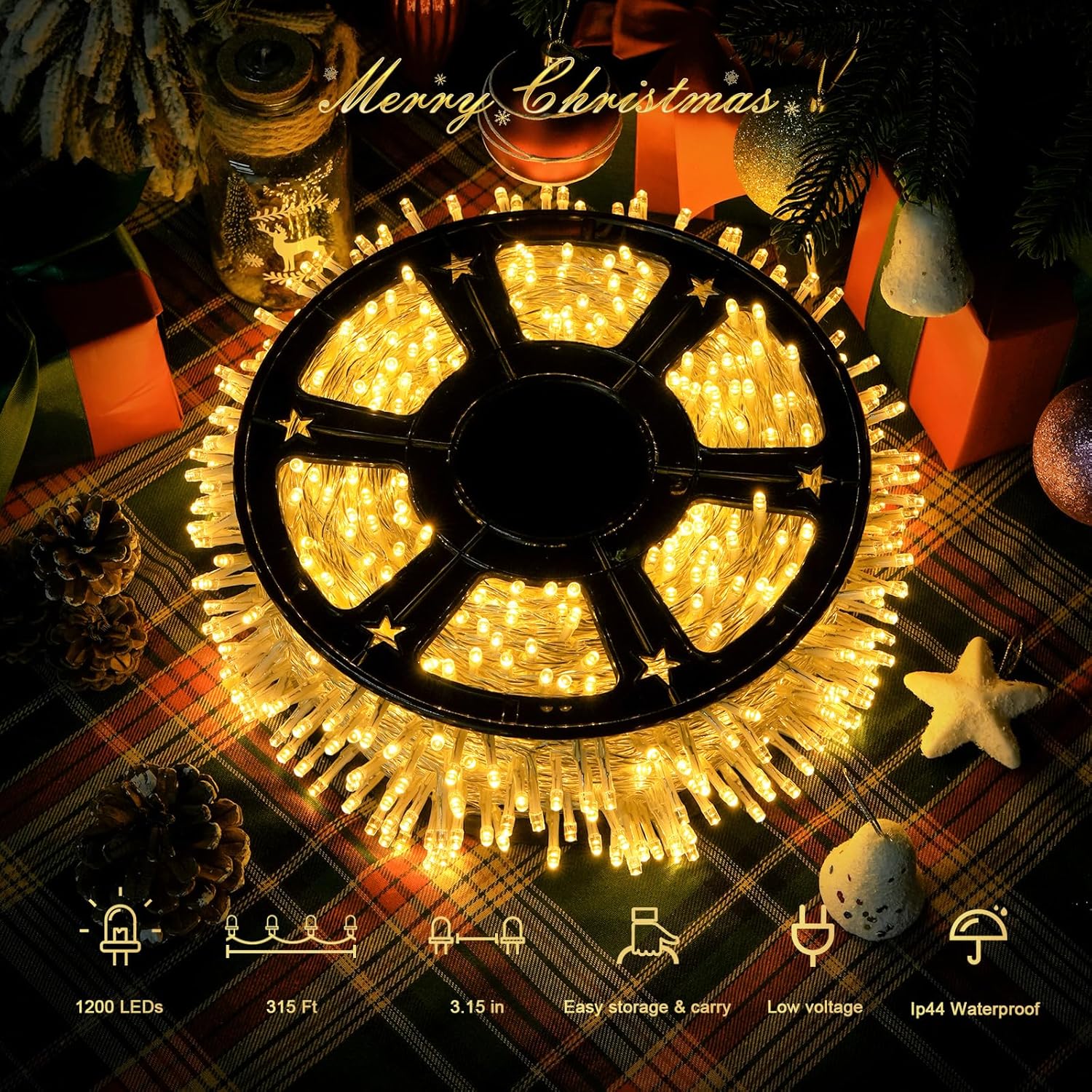 • 【Package Include】You'll receive 1x1200 LED warm white Christmas Lights with a reel, 1x remote control, 1x UL Plug and customer service. Elevate your holiday décor with our top-of-the-line Christmas lights that guarantee festive cheer all year round. If you encounter any issues with our decoration lights, don't hesitate to contact us; we're available 24/7.