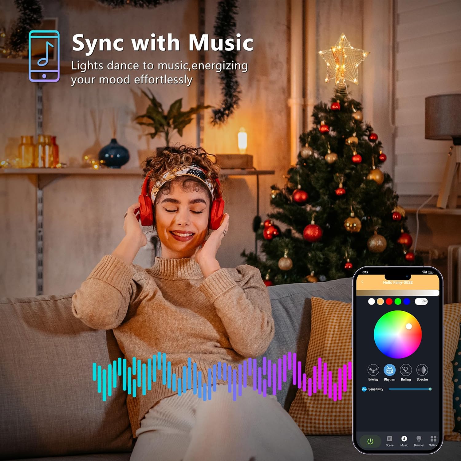• Sync with Music & Group Control: Enhance your holiday festivities with built-in rhythms. Choose from four types—Energy, Rhythm, Rolling, and Spectrum—to sync your smart tree topper lights with your favorite songs, adding a dynamic element to your celebrations. Group manage your color changing tree toppers—adjust colors, brightness, speed, or choose pre-set scenes effortlessly, simple to coordinate your entire holiday display for a cohesive and stunning effect.